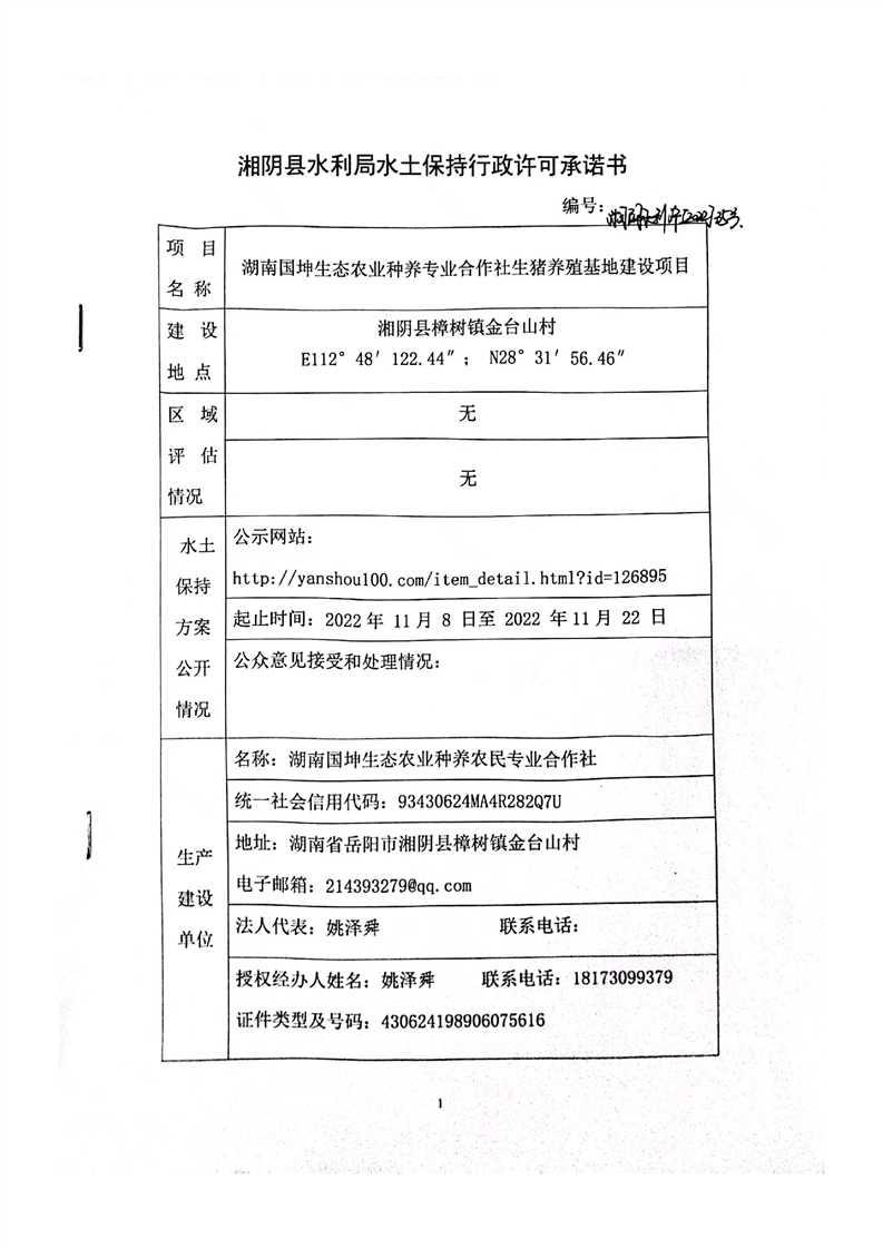 湖南国坤生态农业种养专业合作社生猪养殖基地建设项目水土保持行政许可承诺书