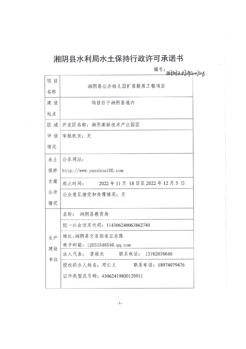 湘阴县公办幼儿园扩容提质工程项目水土保持行政许可承诺书