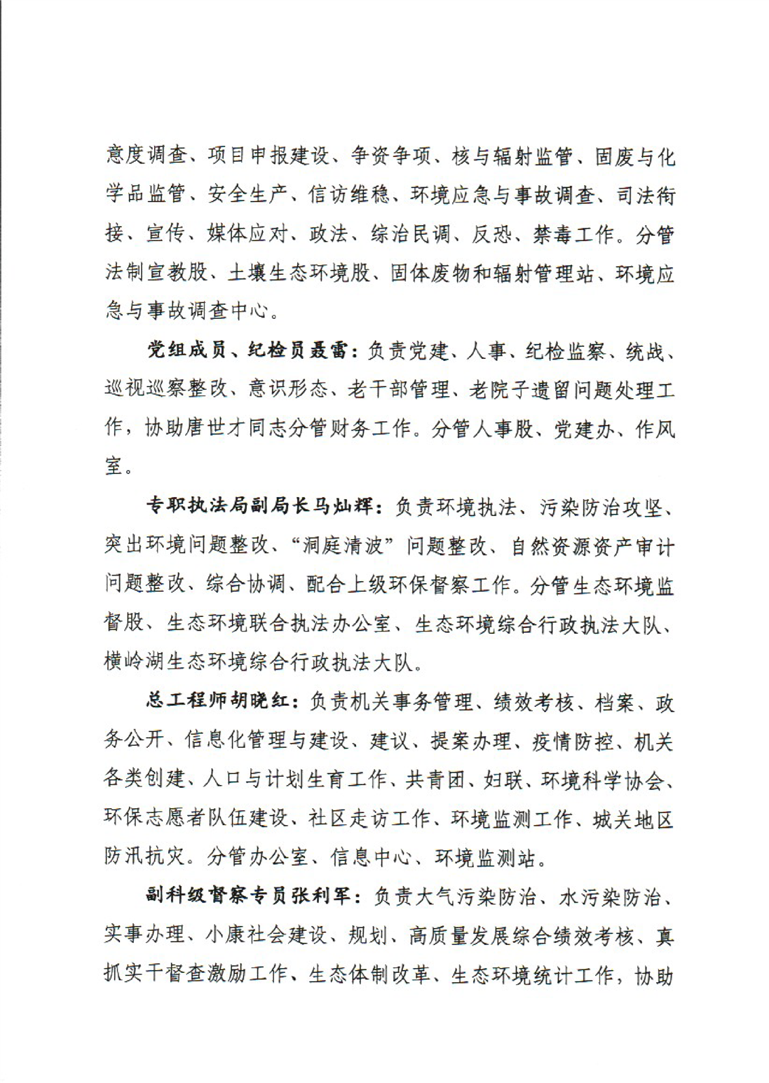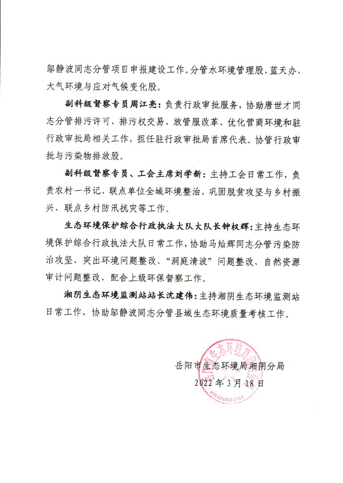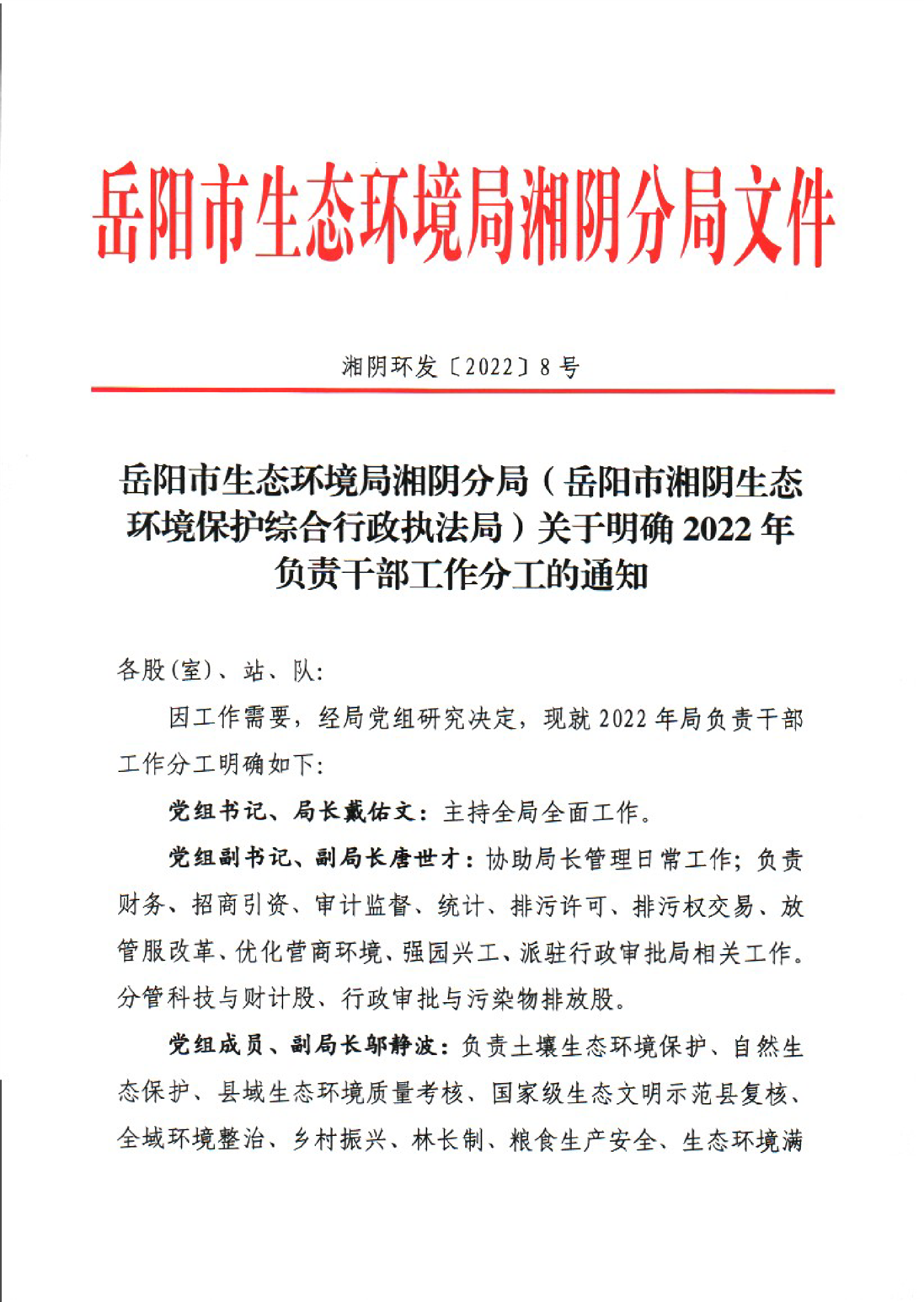 岳阳市生态环境局湘阴分局(岳阳市湘阴生态环境保护综合行政执法局)关于明确2022年负责干部工作