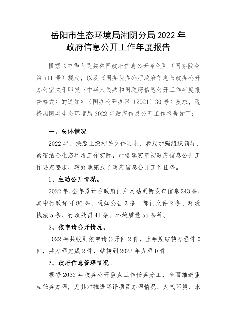 岳阳市生态环境局湘阴分局2022年政府信息公开工作年度报告