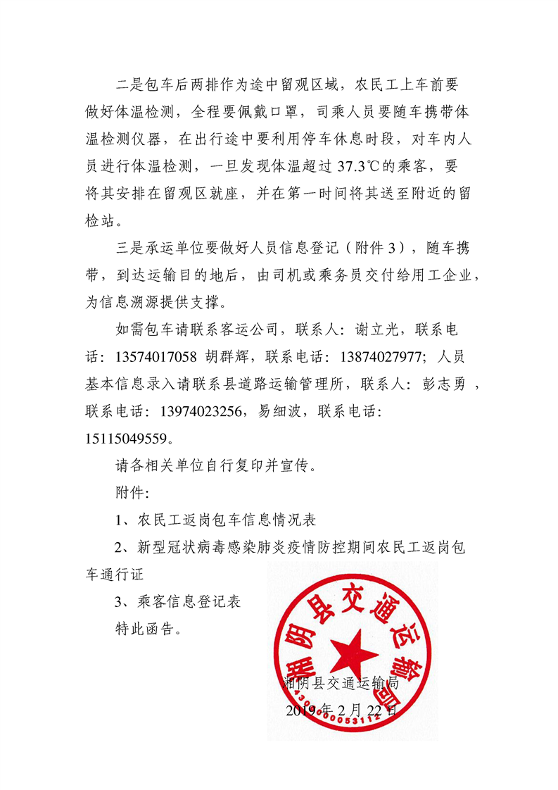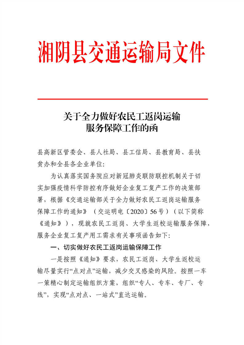 关于全力做好农民工返岗运输服务保障工作的函