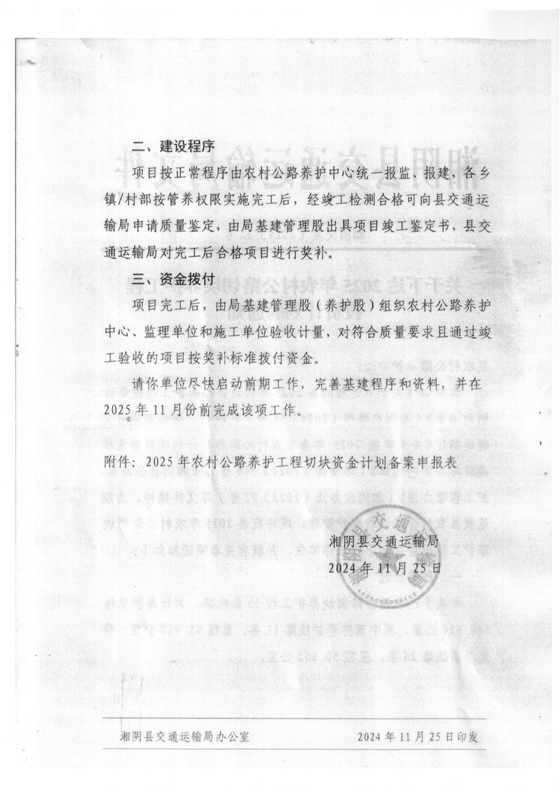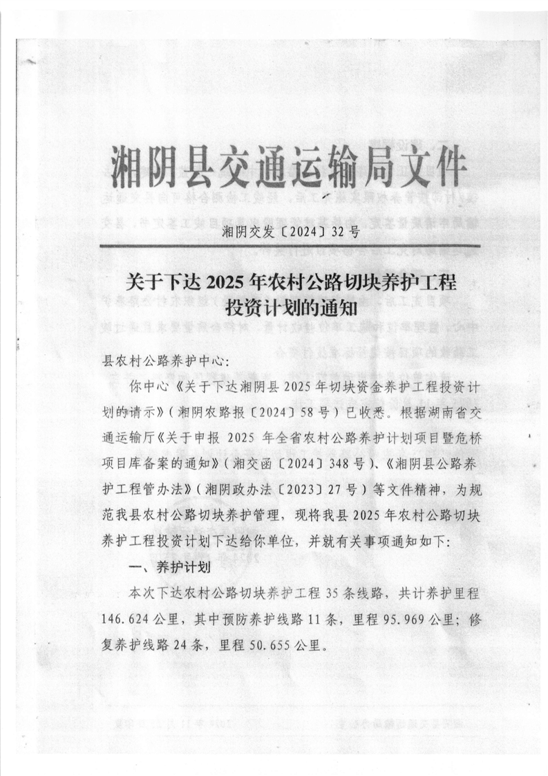 关于下达2025年农村公路切块养护工程投资计划的通知