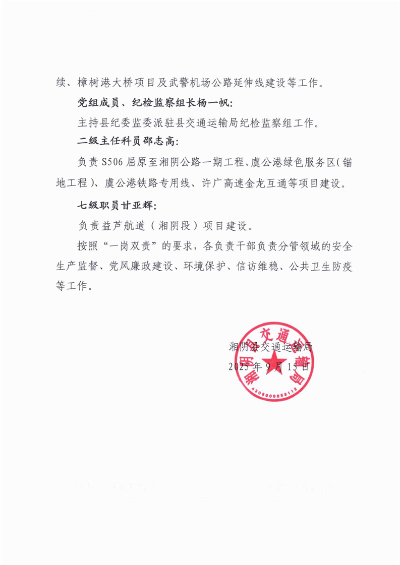 关于调整湘阴县交通运输局负责人工作分工的通知