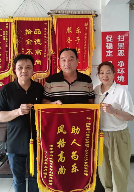 “助人为乐不留姓名,一面锦旗聊表谢意,该夸;不辞辛劳送我母亲回家,这300元车费,该得。”近日,汨罗市白水镇村民刘新龙,走进湘阴县通达出租汽车有限公司办公室,一进门就要求工作人员帮他找到湘FXA395出租车的驾驶员,要当面向其表示感谢。