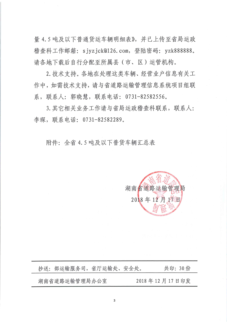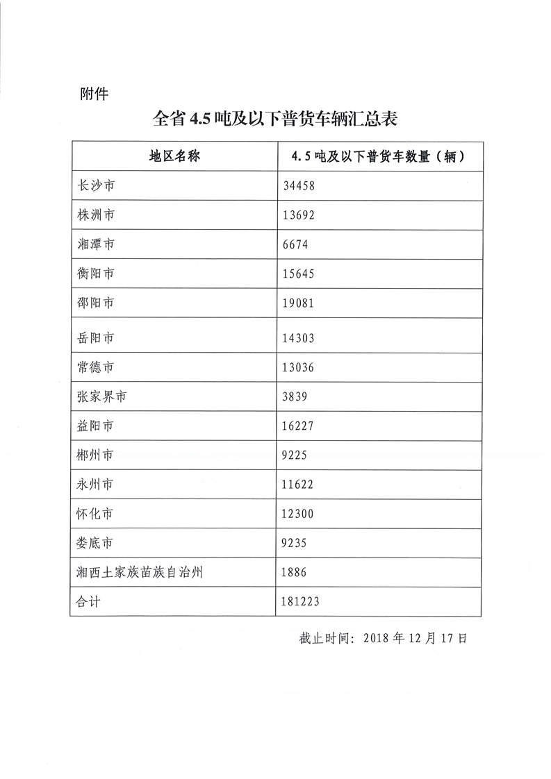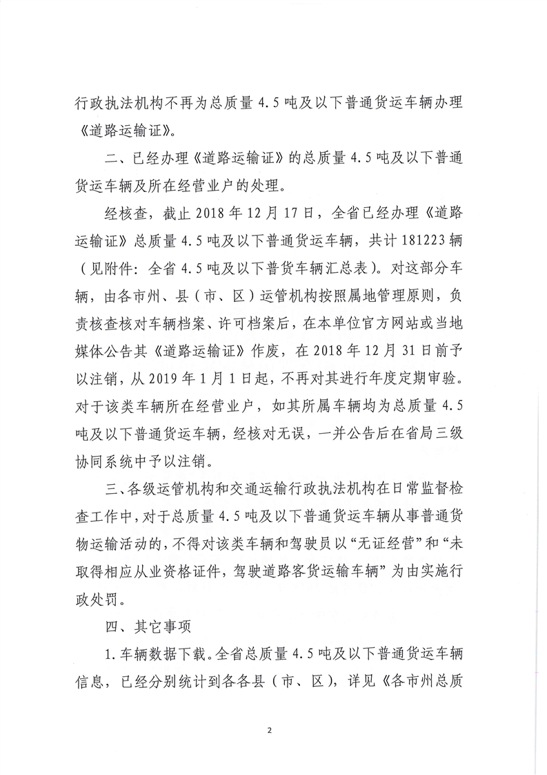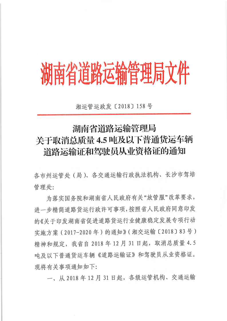 根据湘交运输〔2018〕83号文件《湖南省促进道路货运行业健康稳定发展专项行动(2017-2020年)实施方案》以及湘运管政发〔2018〕158号文件《湖南省道路运输管理局关于取消总质量4.5吨及以下普通货运车辆道路运输证和驾驶员从业资格证的通知》精神,结合我县实际,对我县4.5吨及以下营运货车《道路运输证》进行注销。
