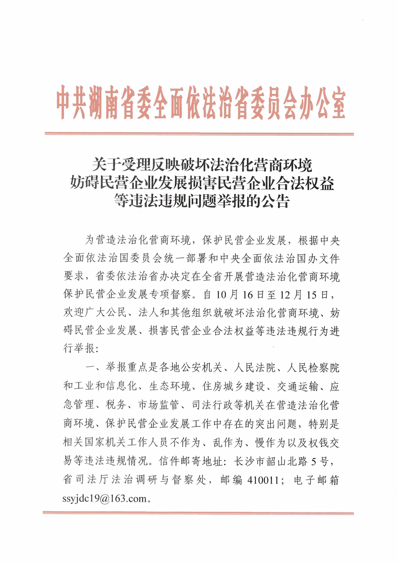 关于受理反映破坏法治化营商环境妨碍民营企业发展损害民营企业合法权益等违法违规问题举报的公告