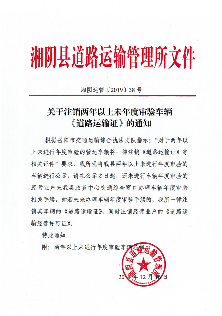 关于注销两年以上未年度审验车辆《道路运输证》的通知