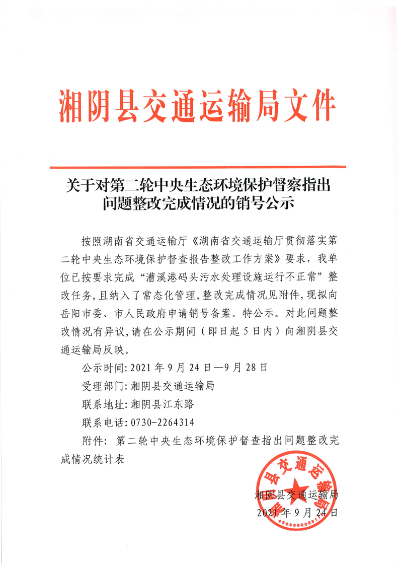 关于对第二轮中央生态环境保护督察指出问题整改完成情况的销号公示