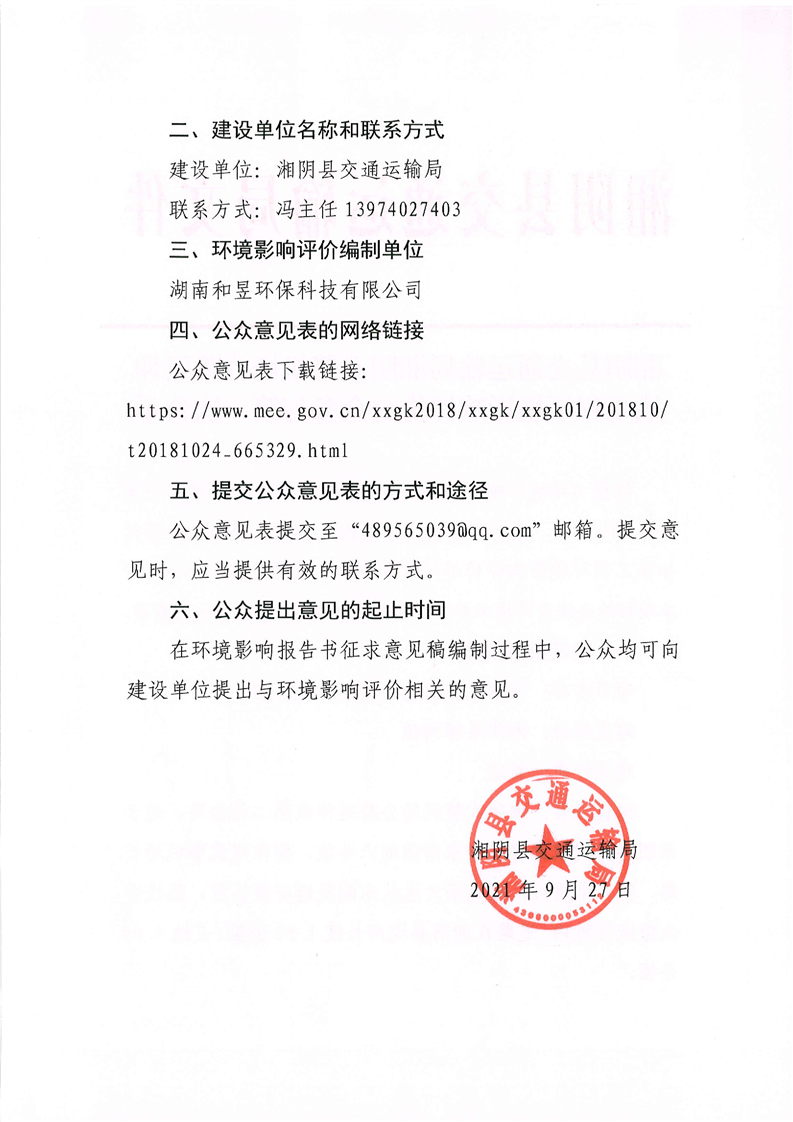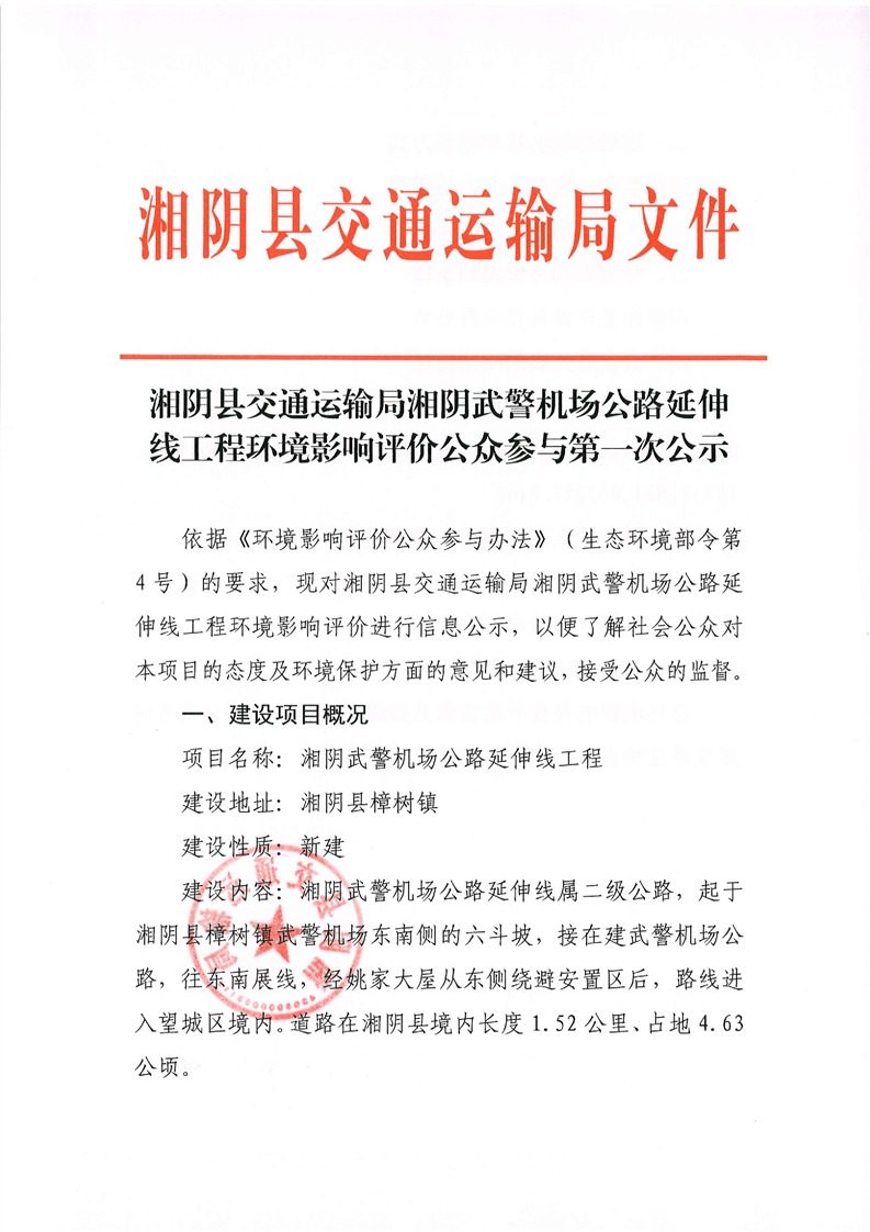湘阴县交通运输局湘阴武警机场公路延伸线工程环境影响评价公众参与第一次公示