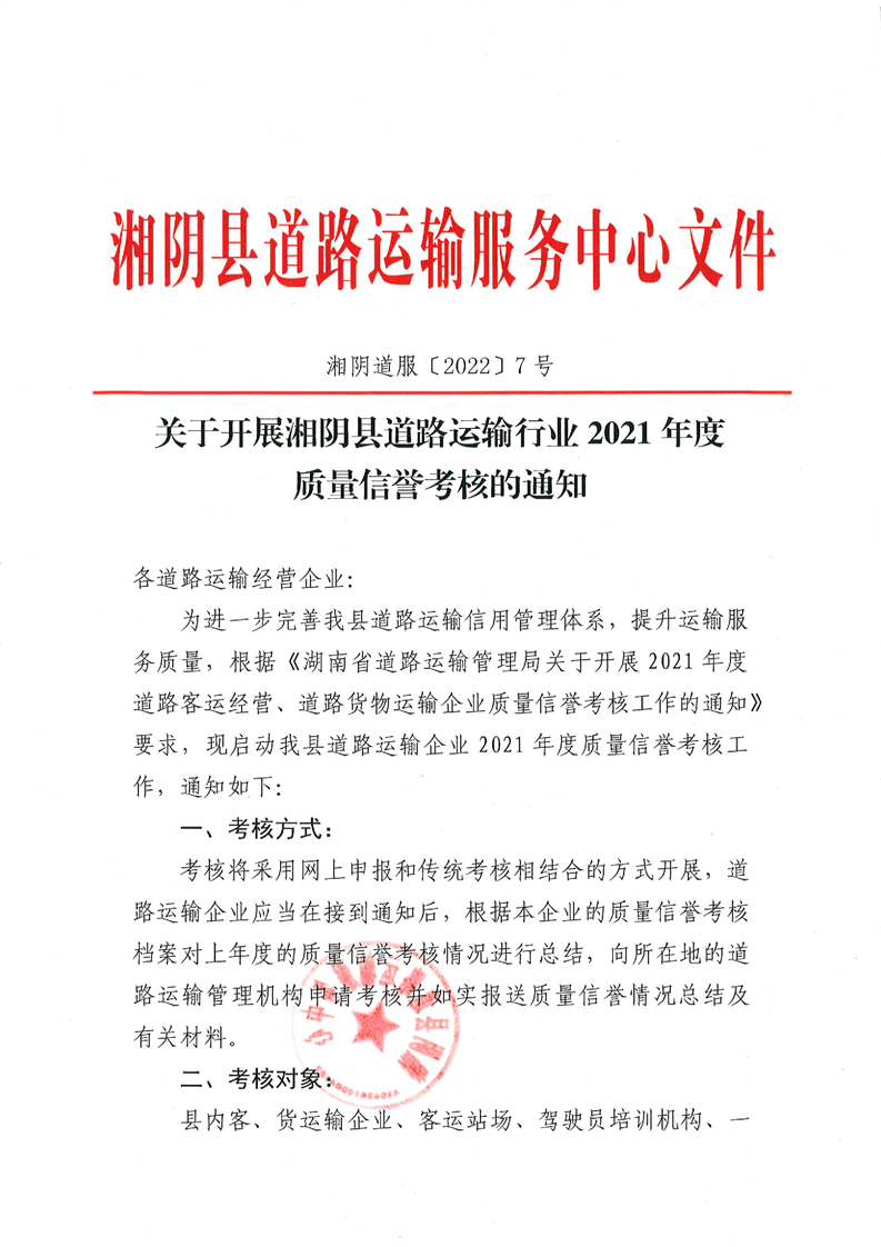 关于开展湘阴县道路运输行业2021年度质量信誉考核的通知