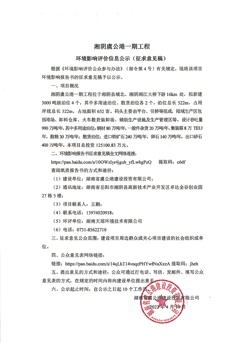 湘阴虞公港一期工程环境影响评价信息公示(征求意见稿)