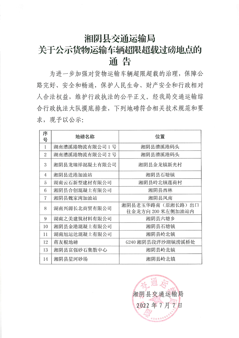湘阴县交通运输局关于公示货物运输车辆超限超载过磅地点的通告