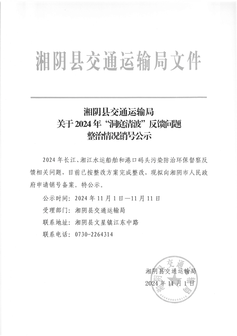 湘阴县交通运输局关于2024年“洞庭清波”反馈问题整治情况销号公示