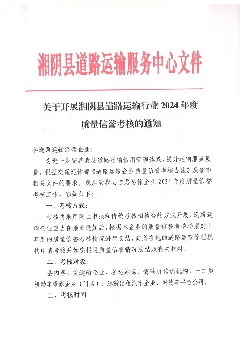 关于开展湘阴县道路运输行业2024年度质量信誉考核的通知