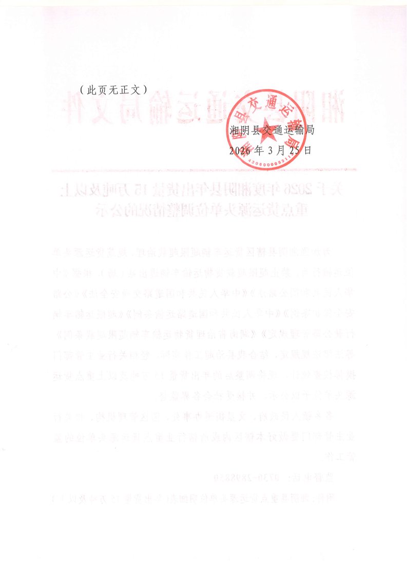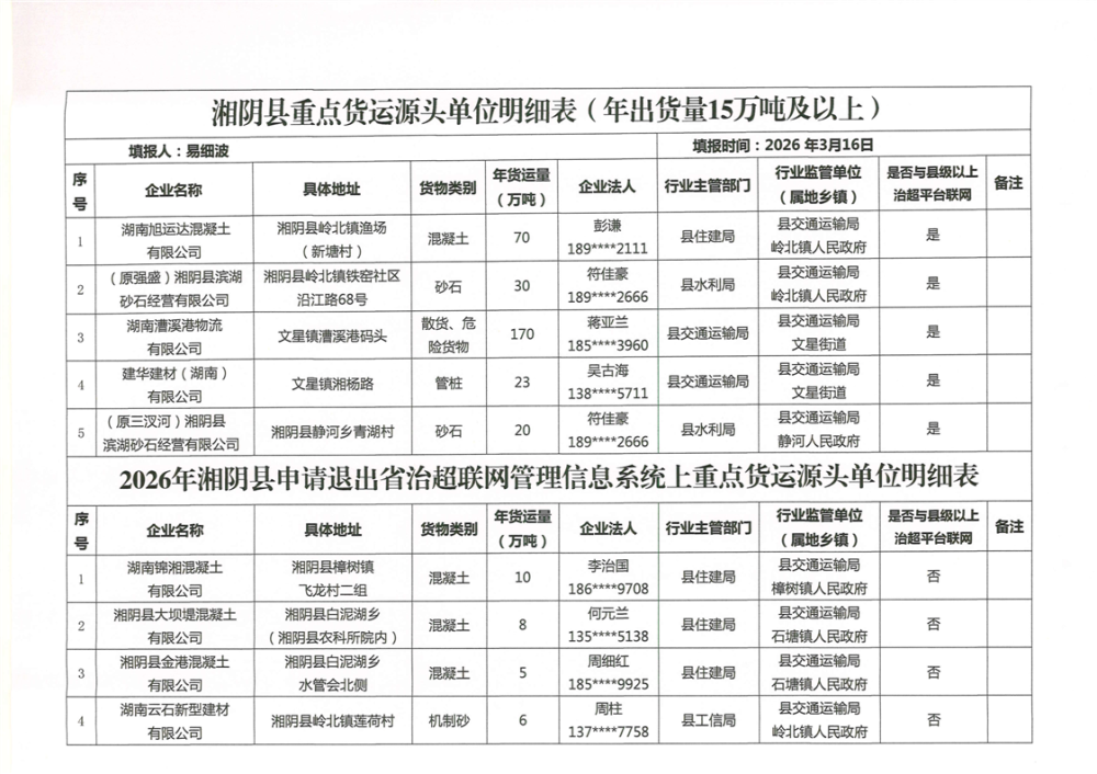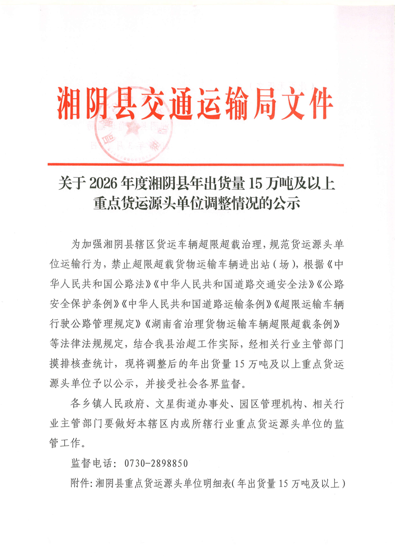 关于2026年度湘阴县年出货量15万吨以上重点货运源头单位调整情况的公示