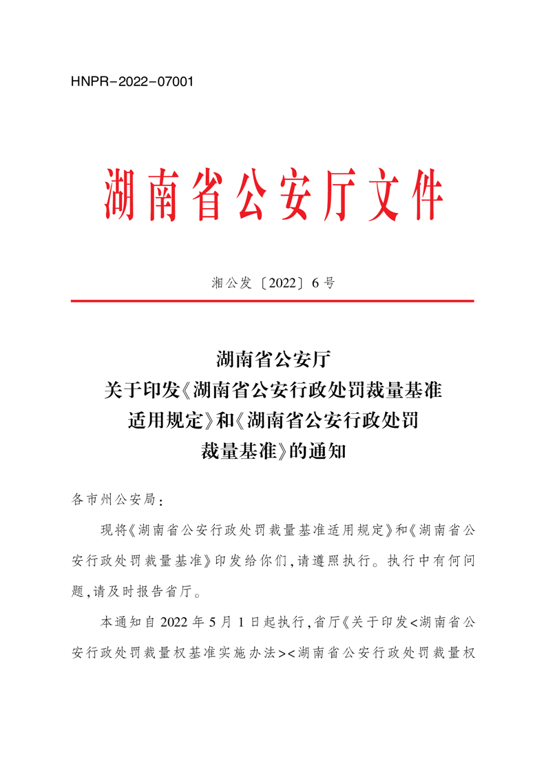 湖南省公安厅关于印发《湖南省公安行政处罚裁量基准适用规定》和《湖南省公安行政处罚裁量基准》的通知
