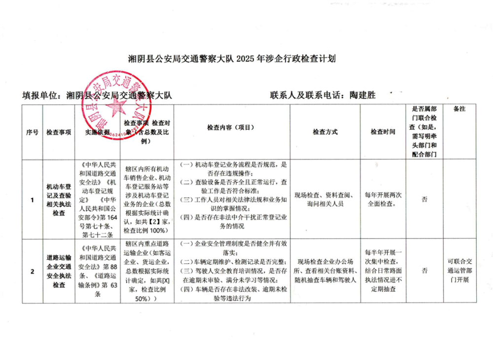 湘阴县公安局交通警察大队2025年涉企行政执法检查清单
