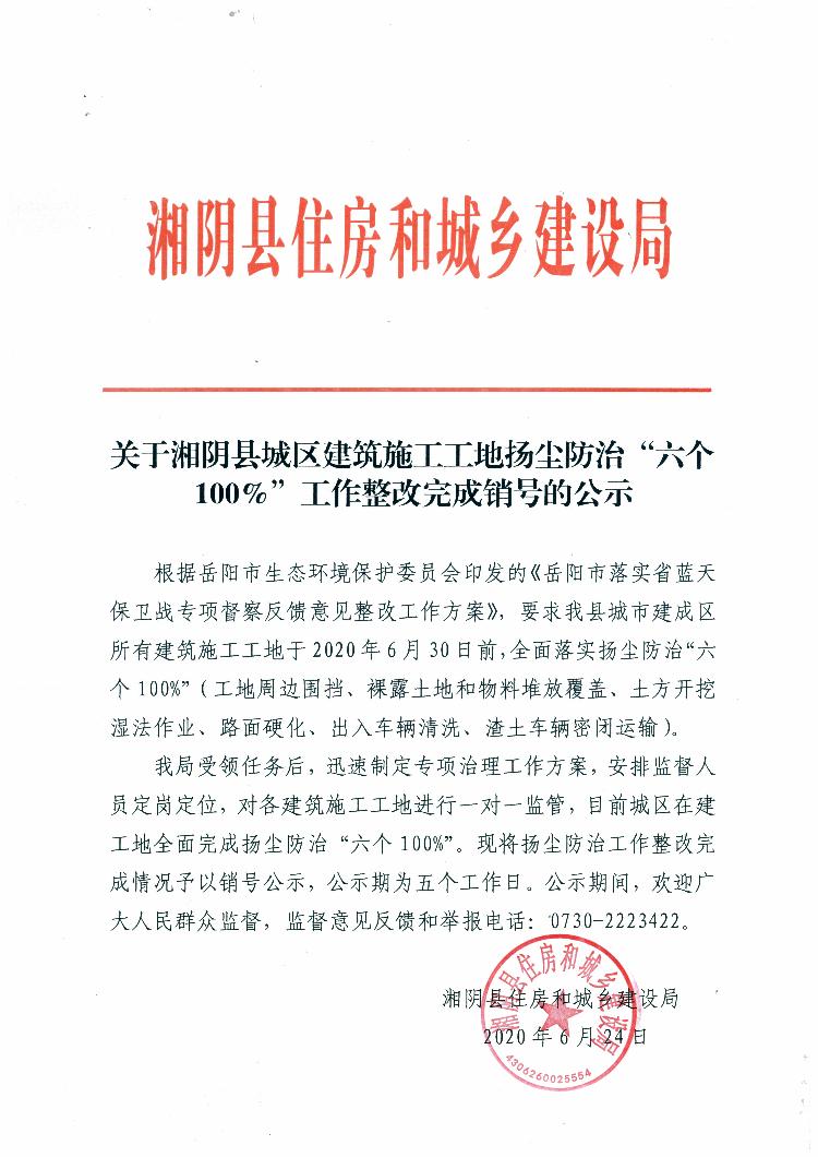湘阴县住房和城乡建设局 关于湘阴县城区建筑施工工地扬尘防治“六个100%”工作整改完成销号的公示