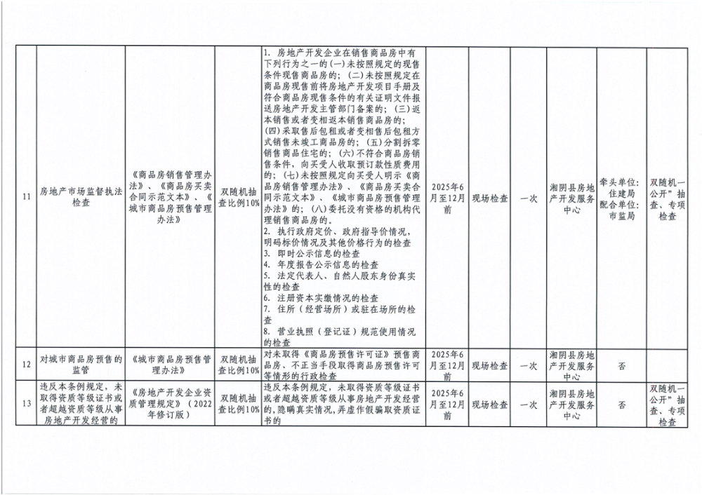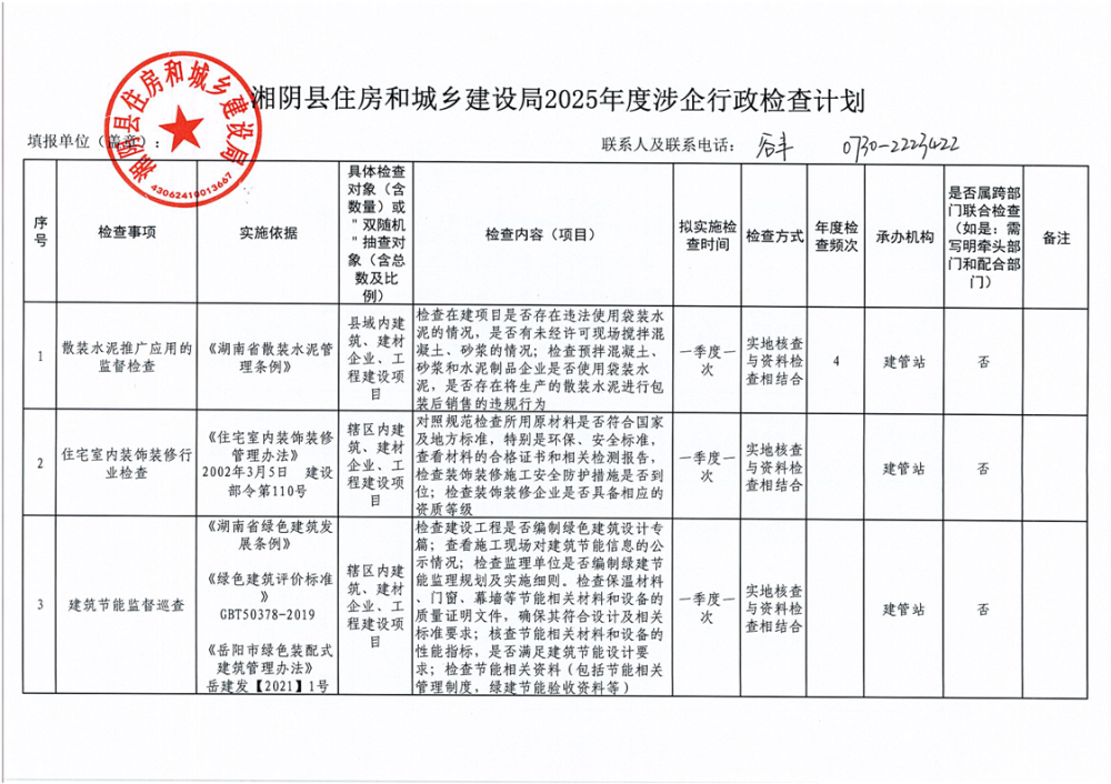 湘阴县住房和城乡建设局2025年度涉企行政检查计划