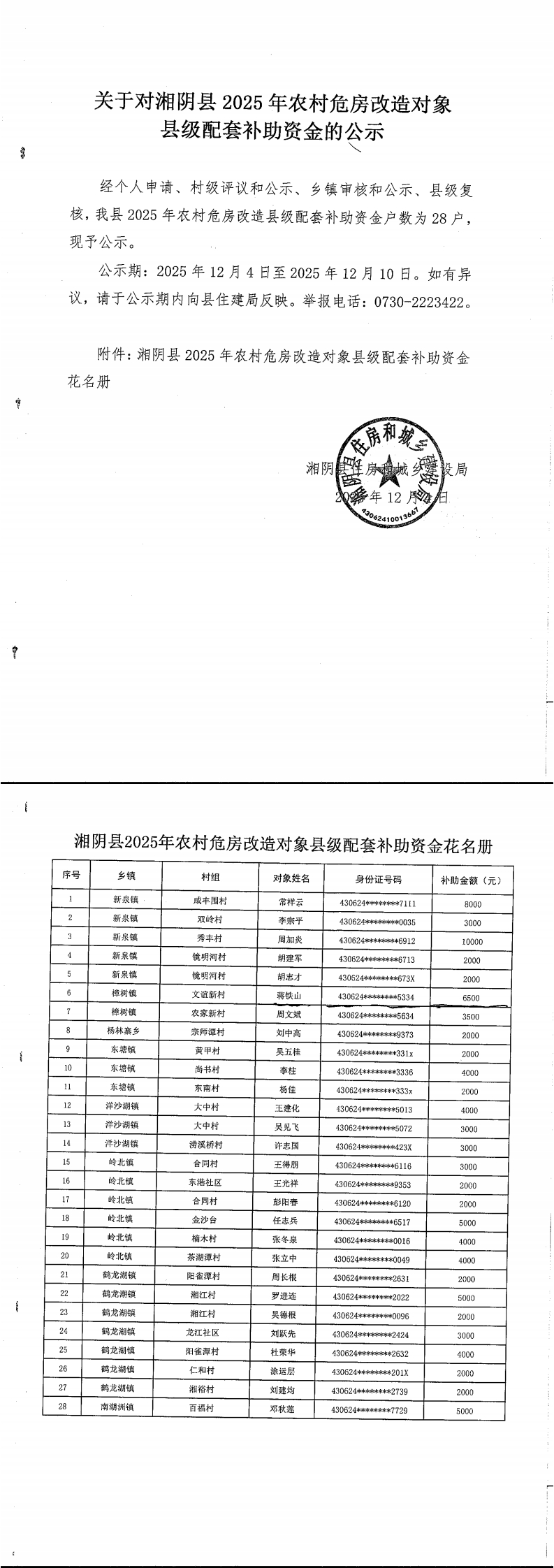 关于对湘阴县2025年农村危房改造对象县级配套补助资金的公示