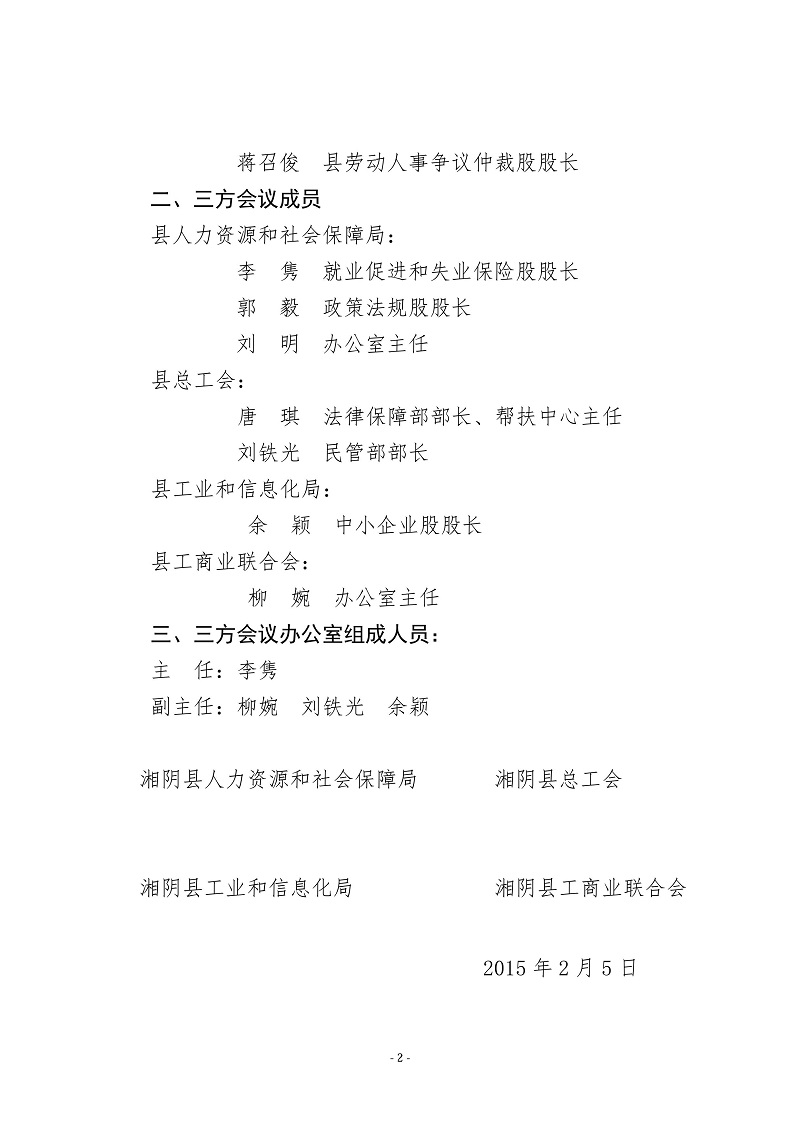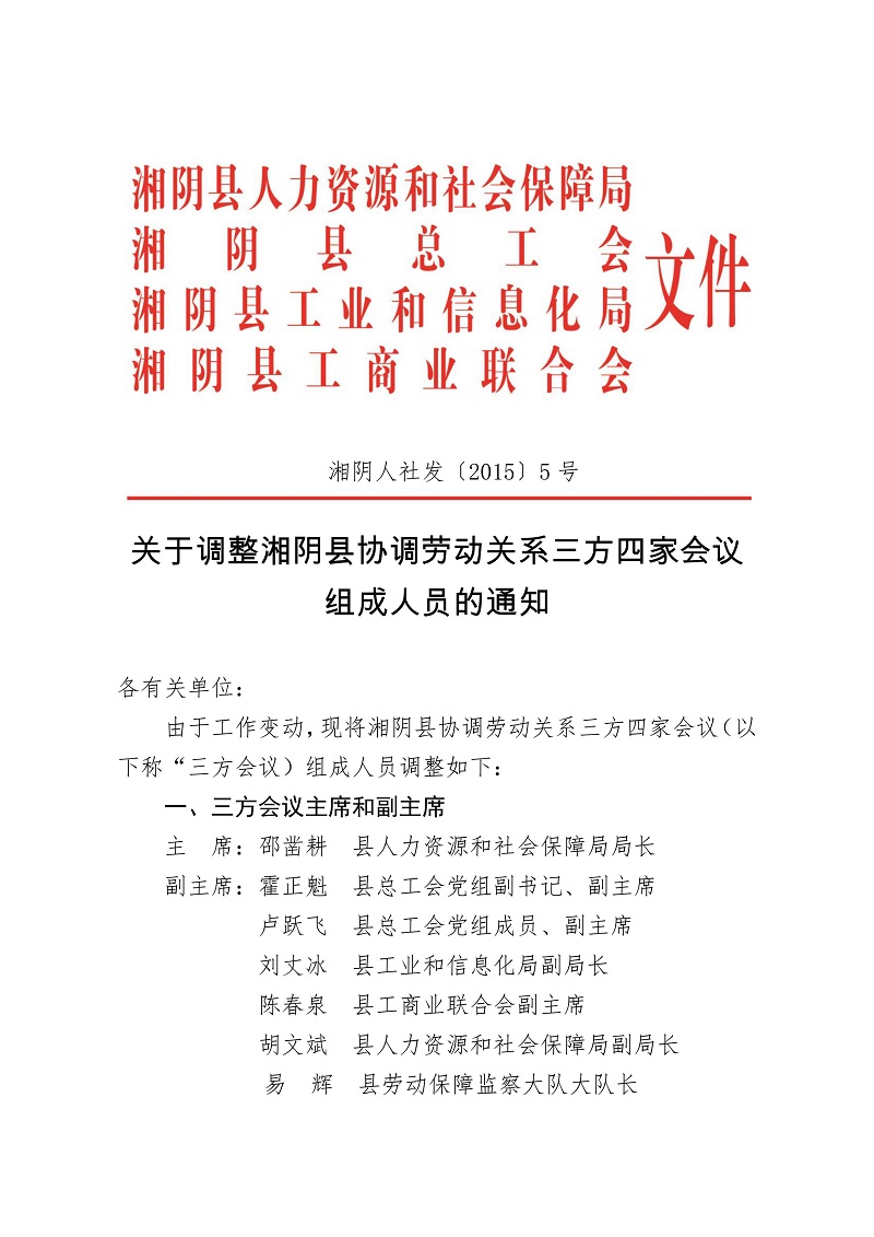 湘阴人社发〔2015〕5号 关于调整湘阴县协调劳动关系三方四家会议组成人员的通知