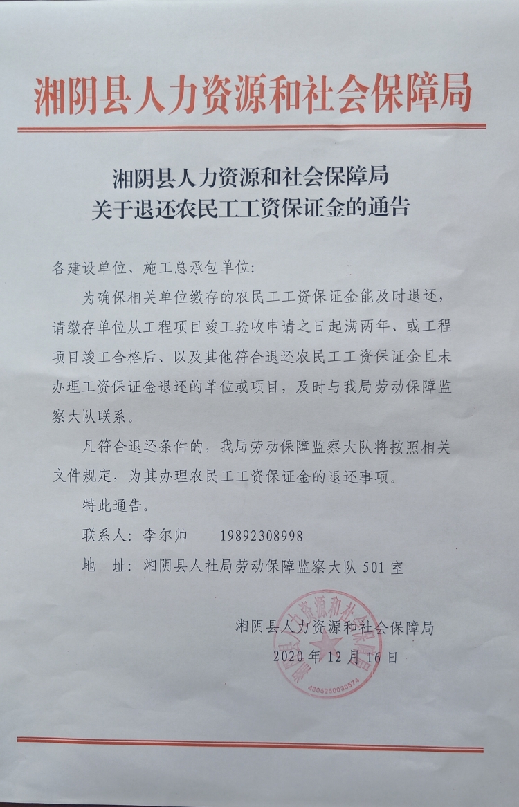 湘阴县人力资源和社会保障局 关于退还农民工工资保证金的通告