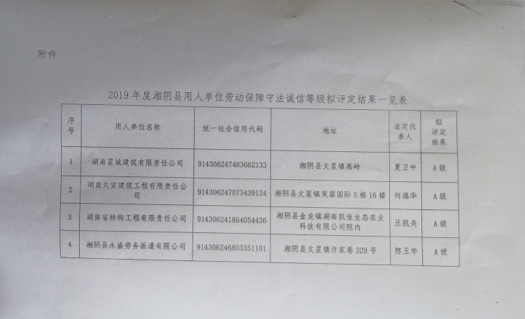 附件:2019年度湘阴县用人单位劳动保障守法诚信等级拟评定结果一览表
