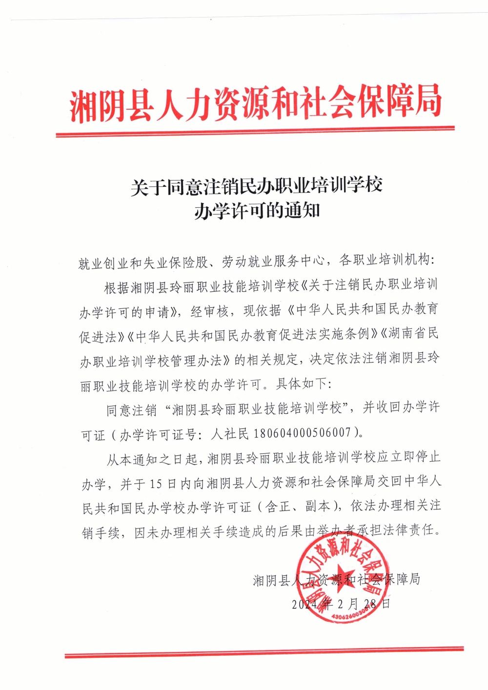 关于同意注销民办职业培训学校办学许可的通知