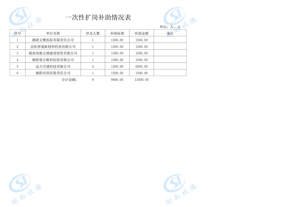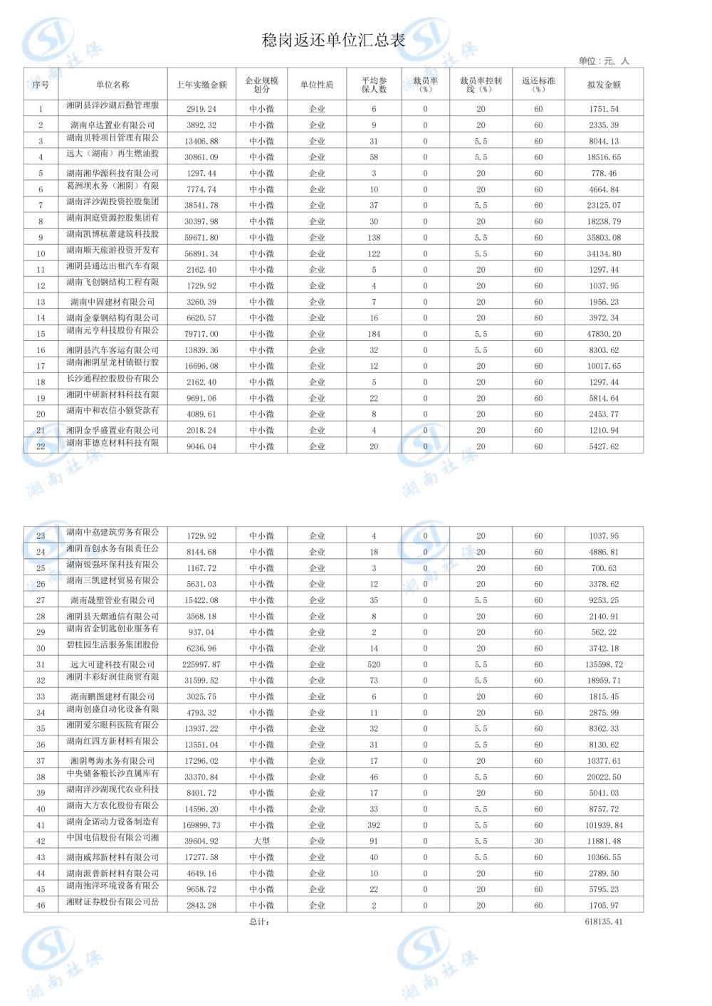 根据湘人社办函〔2023〕58号文件,经人社系统数据对比,以下46家单位符合2023年第一批稳岗返还补贴申请条件,总金额:618135.41元。以下6家单位符合2023年第一批一次性扩岗补助申请条件,总金额:13500元。具体名单附后。