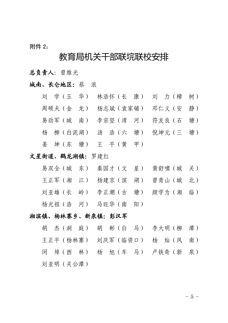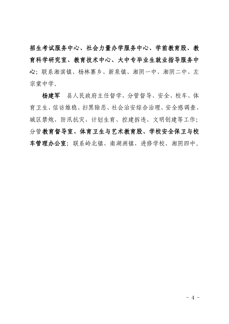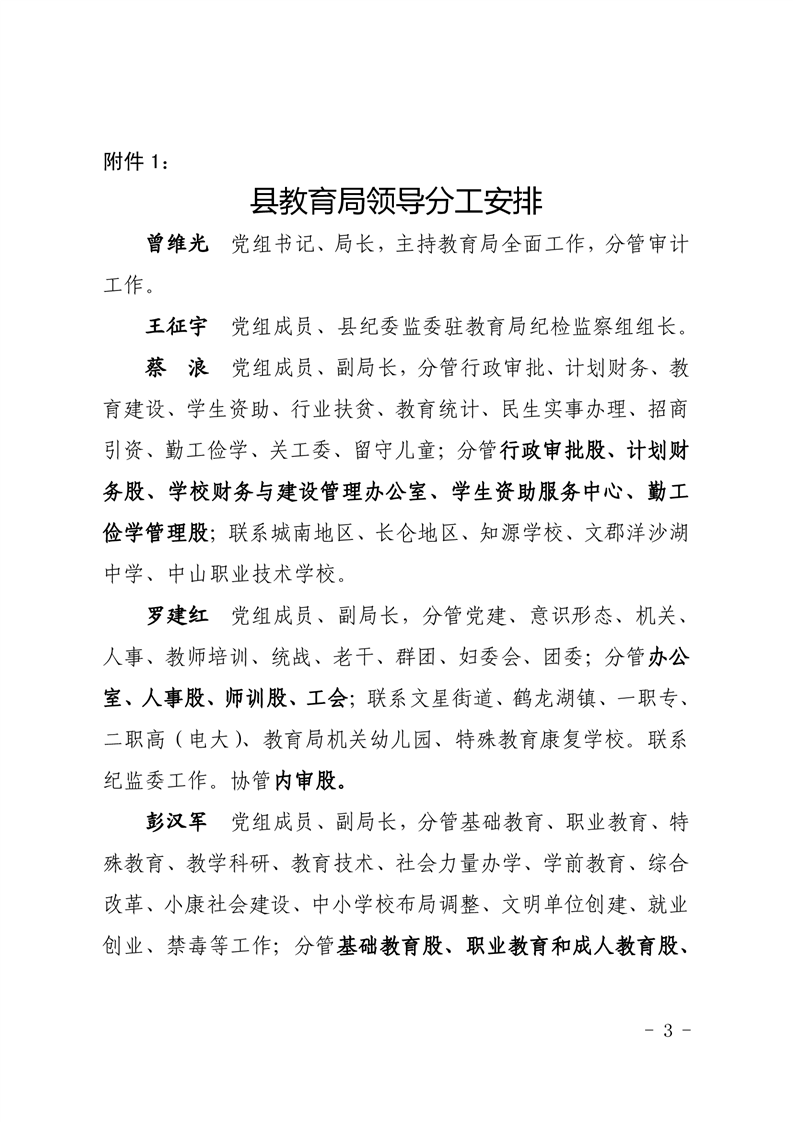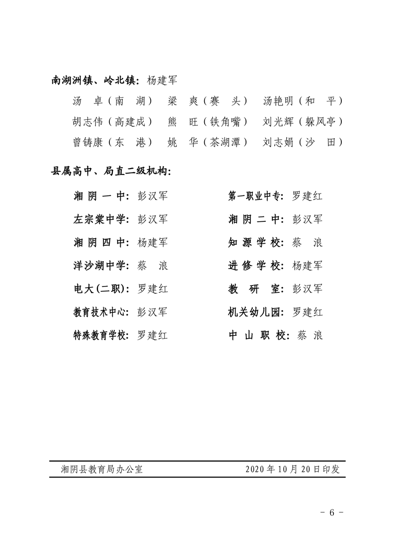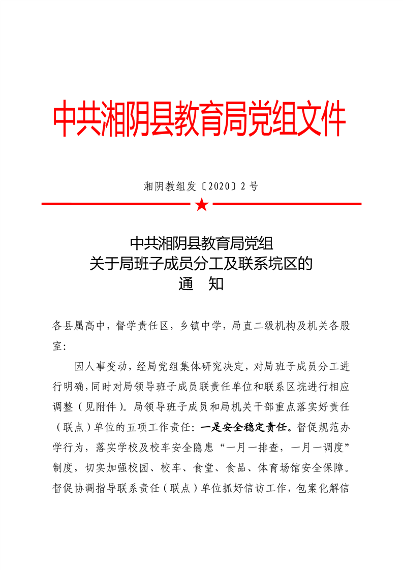 中共湘阴县教育局党组局班子成员分工及联系垸区