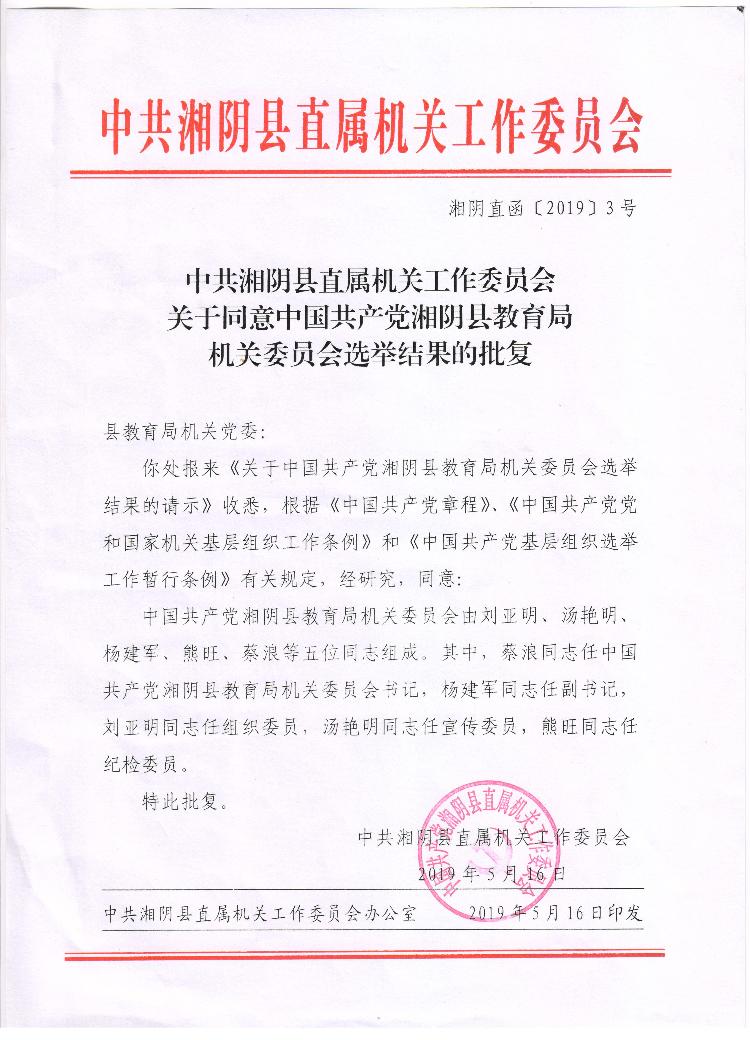 关于同意中国共产党湘阴县教育局机关委员会选举结果的批复