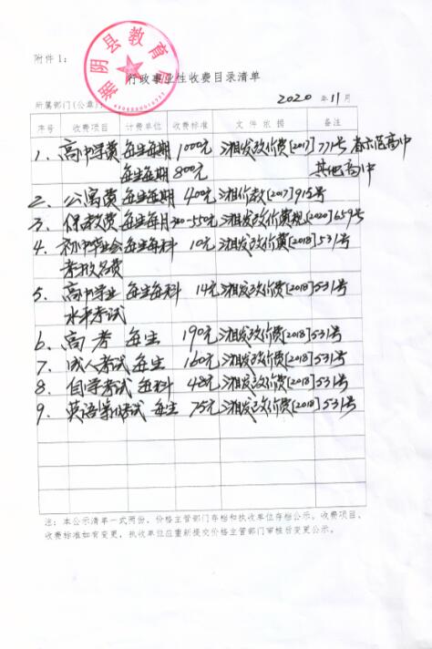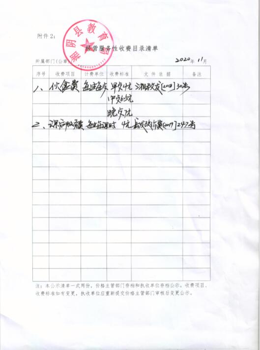 湘阴县教育系统行政事业性、经营服务性收费目录清单