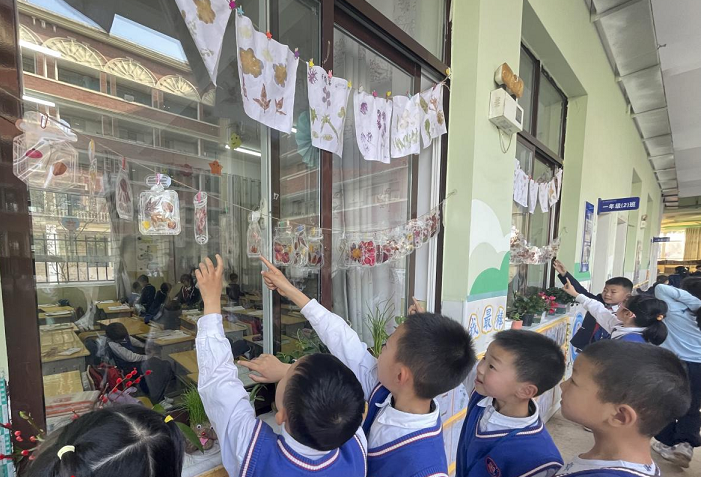 风筝在窗边起舞,印染手帕在阳光里飘动,教室后方是孩子们用粘土“打造”的海底世界,外墙上都是孩子们根据项目任务完成的学习单……3月27日,走进湘阴县城东学校小学部,处处展示着该校一年级师生近期在“发现春天,感受春天”全课程项目化学习活动中共赴春日“盛宴”的成果,布满了“全课程”育人的“足迹”。