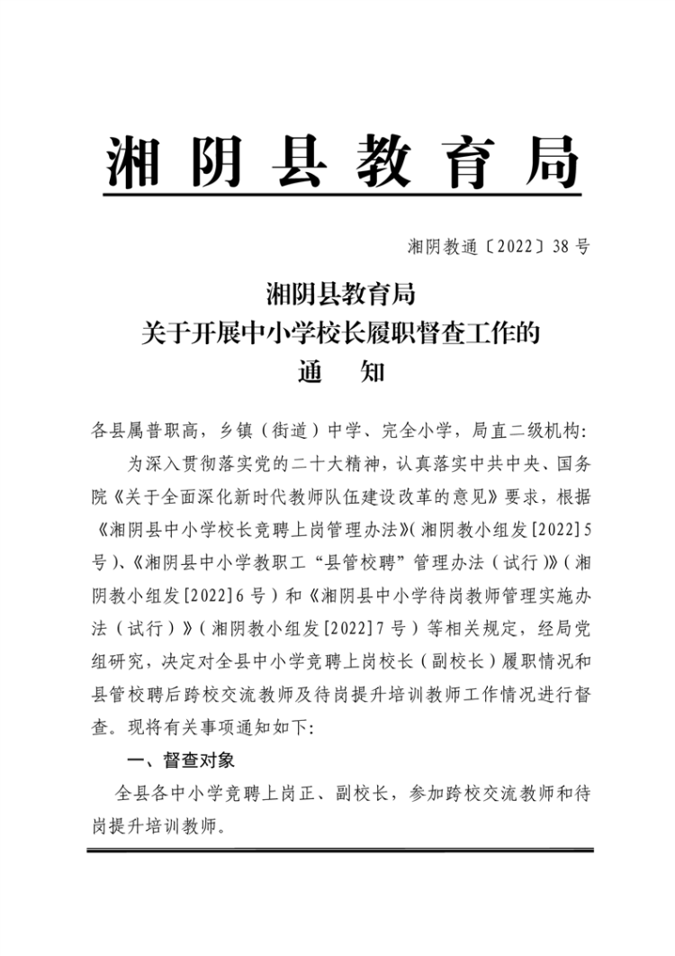 湘阴教通〔2022〕38号关于开展中小学校长履职督查工作的通知