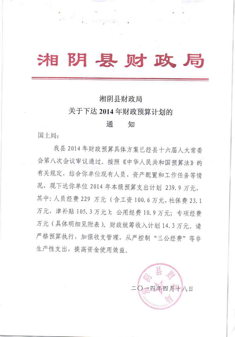 湘阴县国土资源局2014年预算编制说明