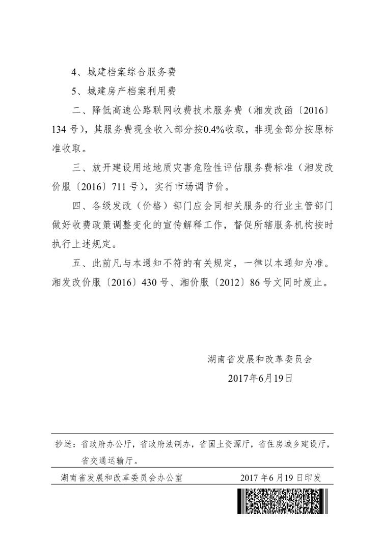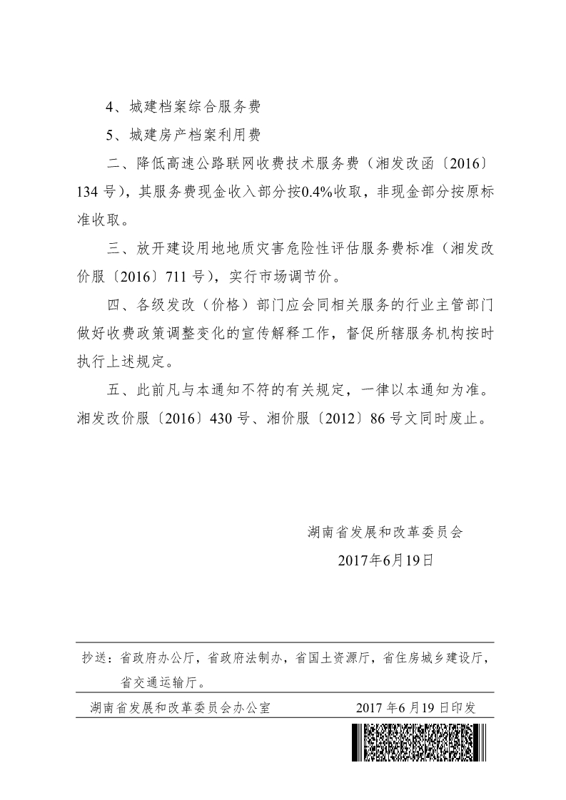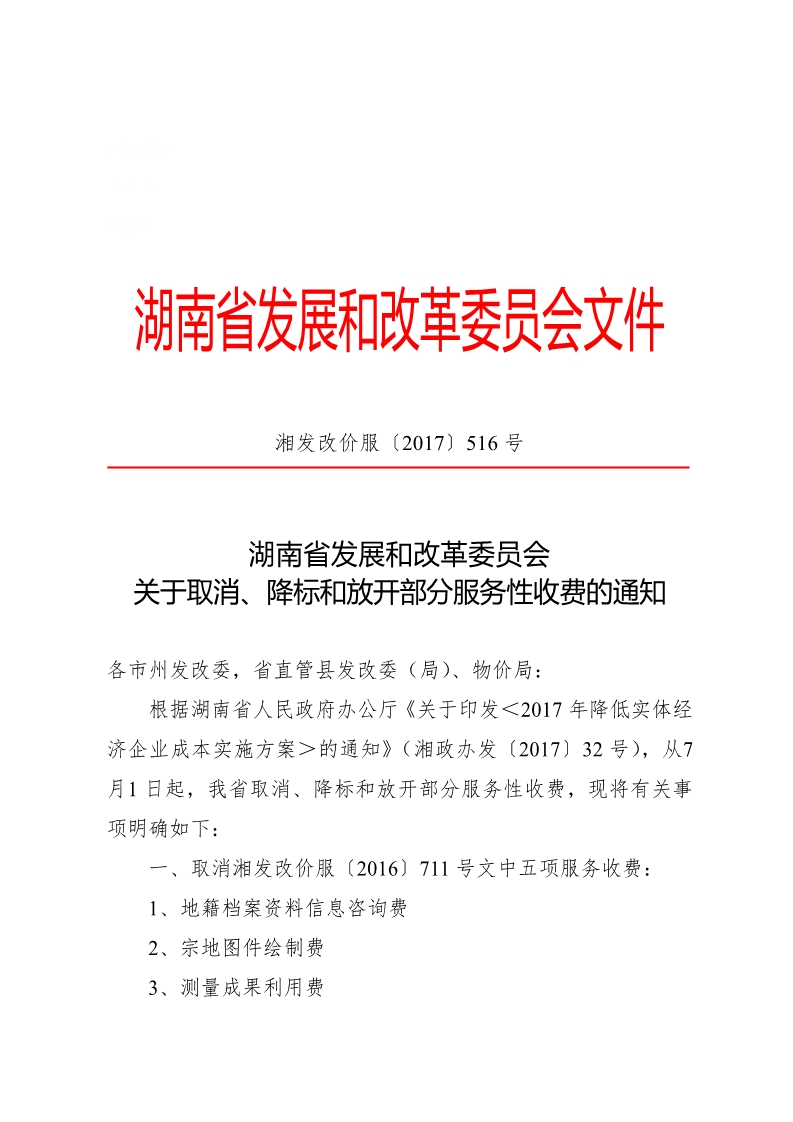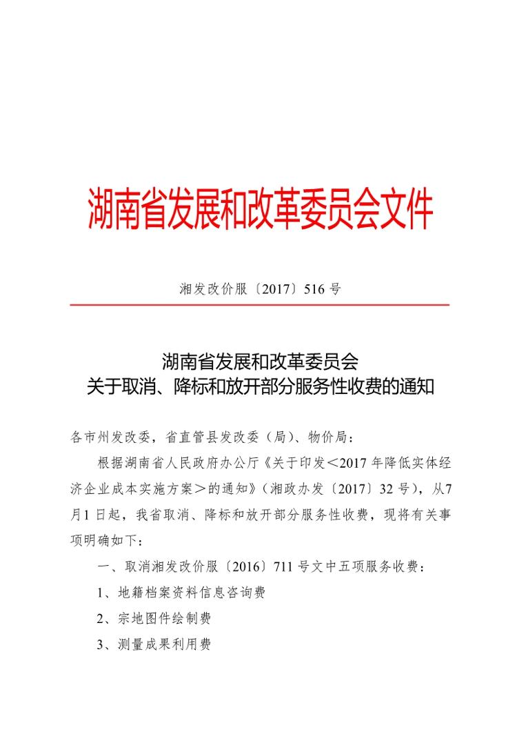 湖南省发展和改革委员会关于取消、降标和放开部分服务性收费的通知|湘发改价服[2017]516号