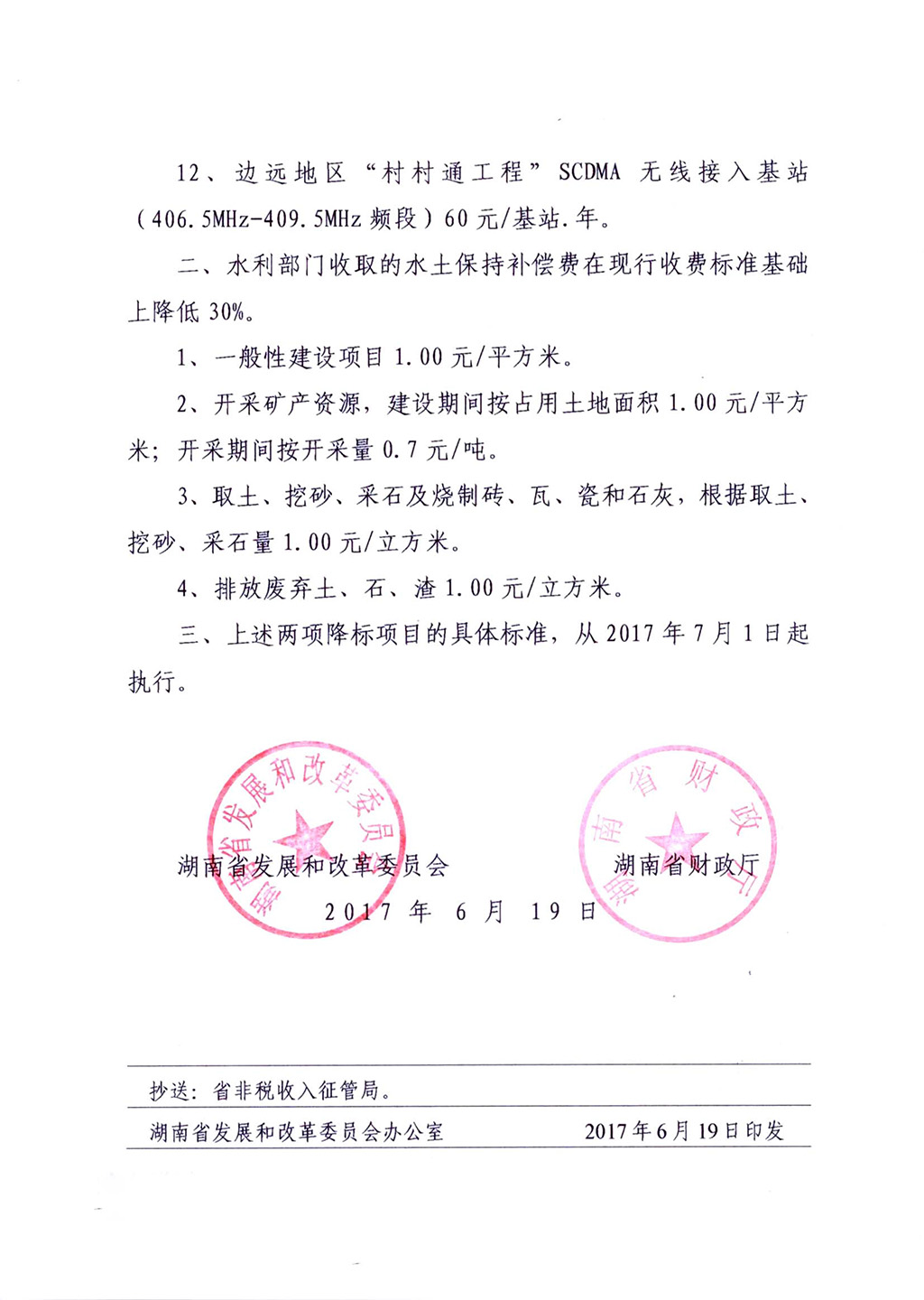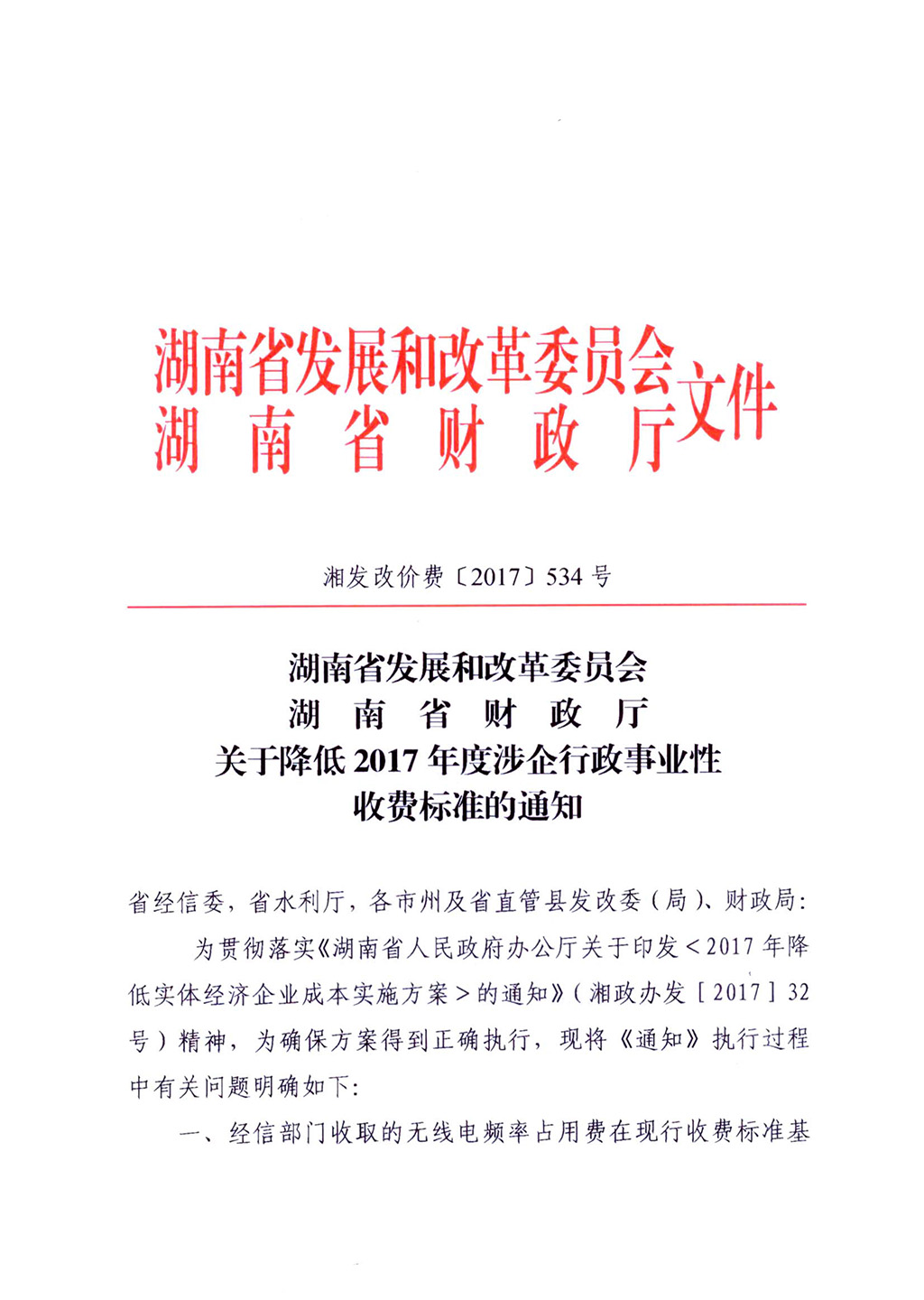 湖南省发展和改革委员会 湖南省财政厅关于降低2017年度涉企行政事业性收费标准的通知|湘发改价费[2017]534号