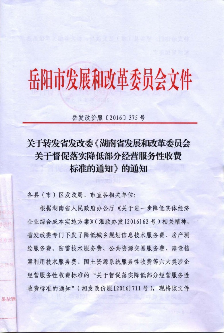收费性文件:岳发改价服[2016]375号文件(转发湘发改价服[2016]711号文件)