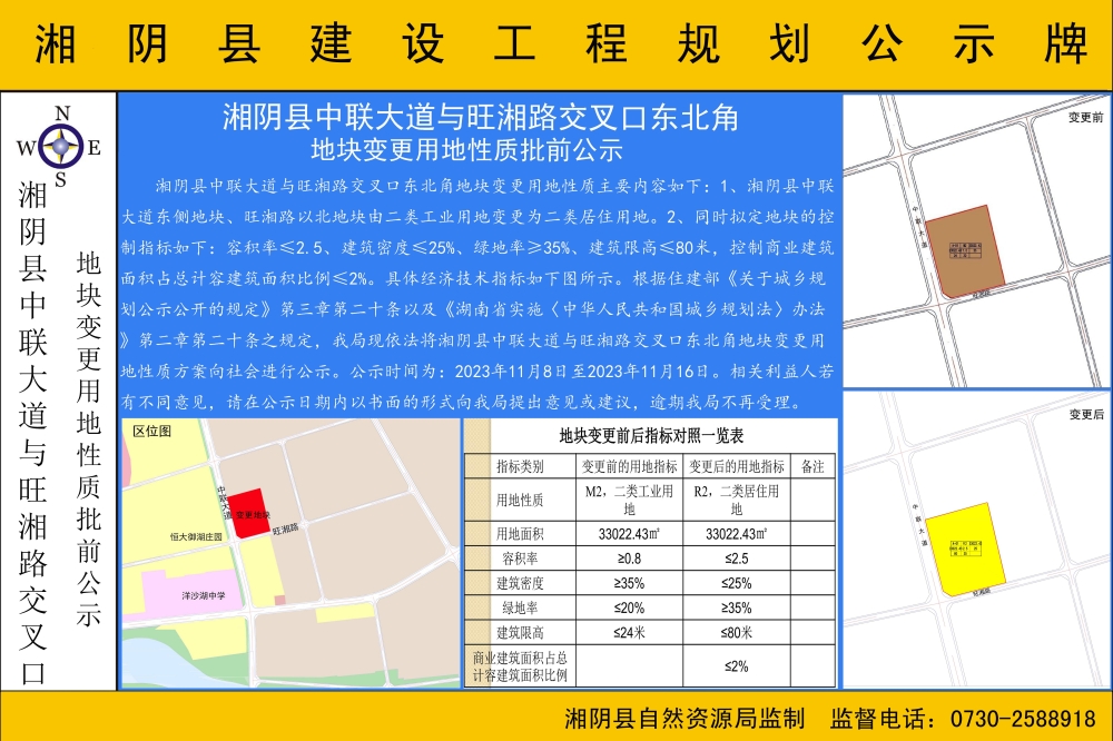 湘阴县中联大道与旺湘路交叉口东北角地块变更用地性质批前公示