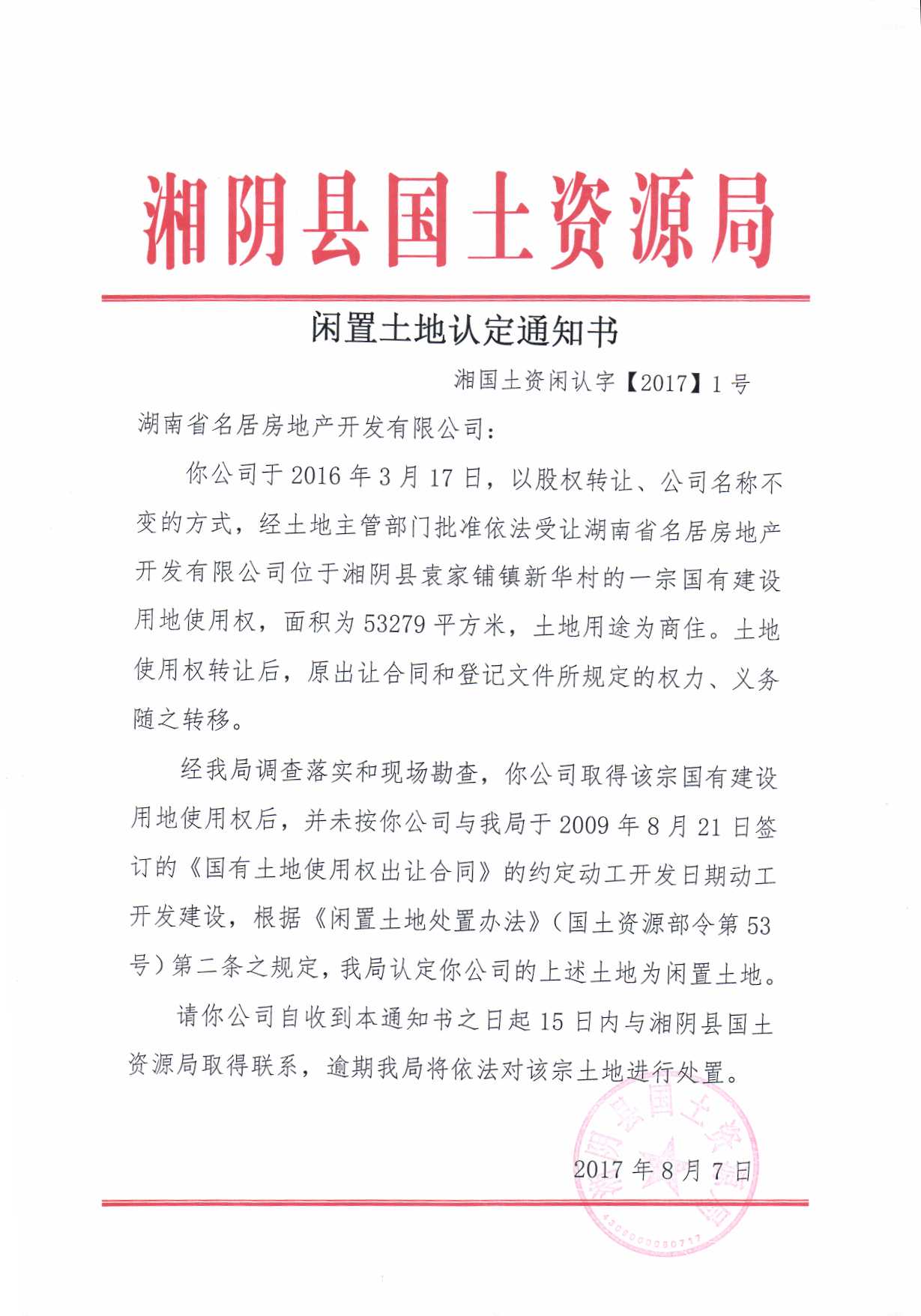 闲置土地认定通知书|湘国土资闲认字[2017]1号