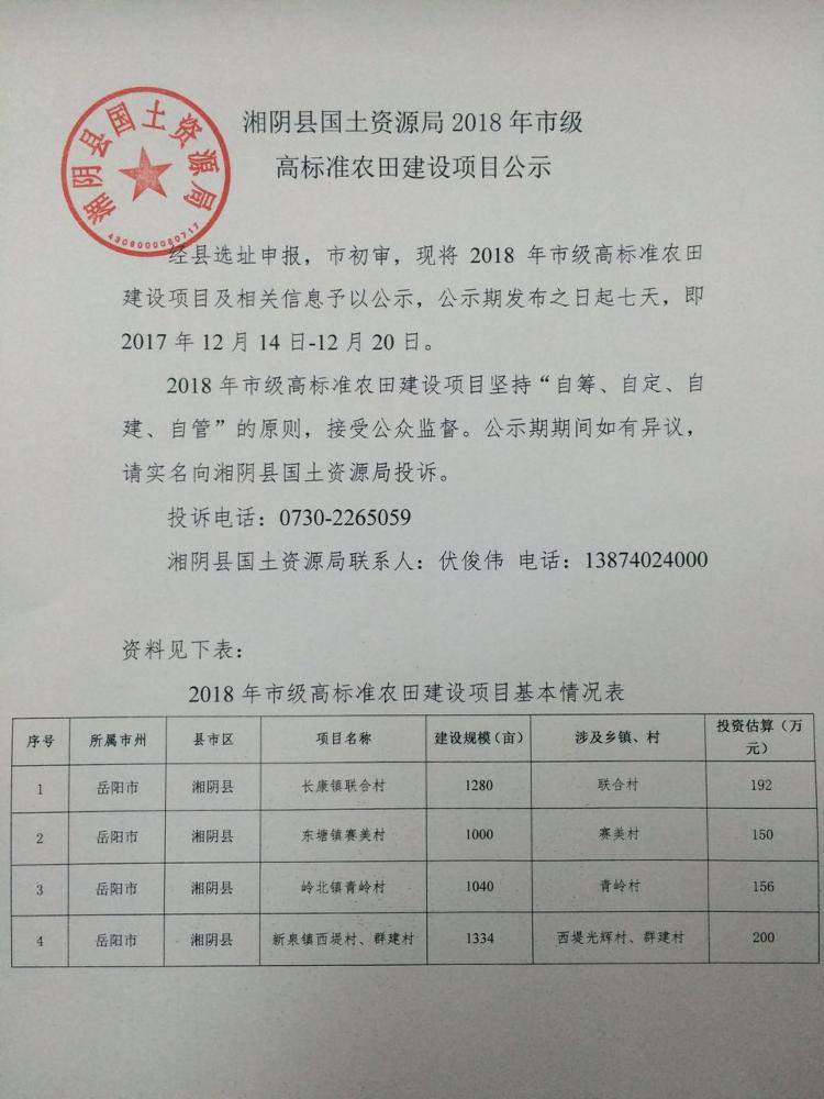 湘阴县国土资源局2018年市级高标准农田建设项目公示