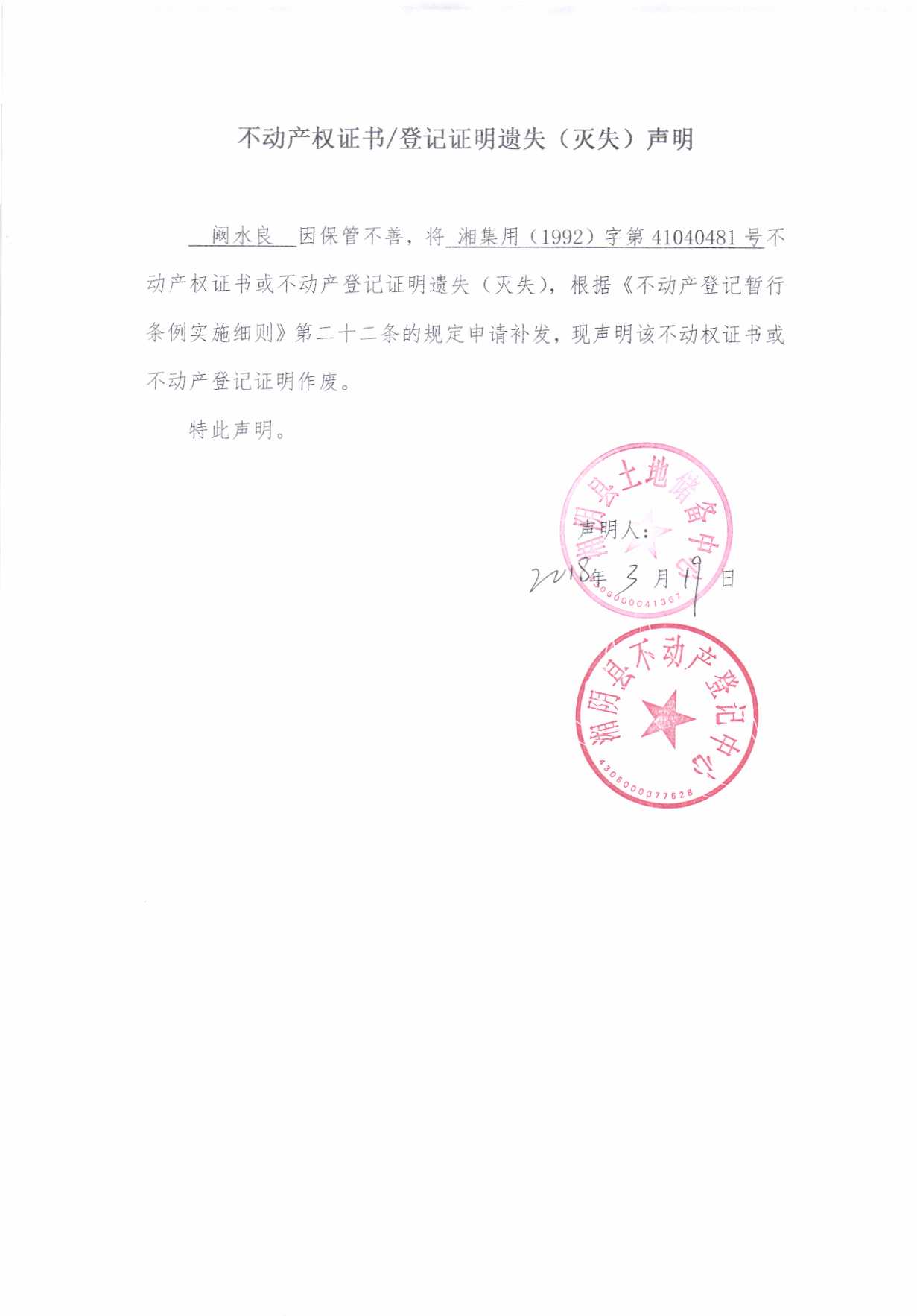 不动产权证书/登记证明遗失(灭失)声明|阚水良