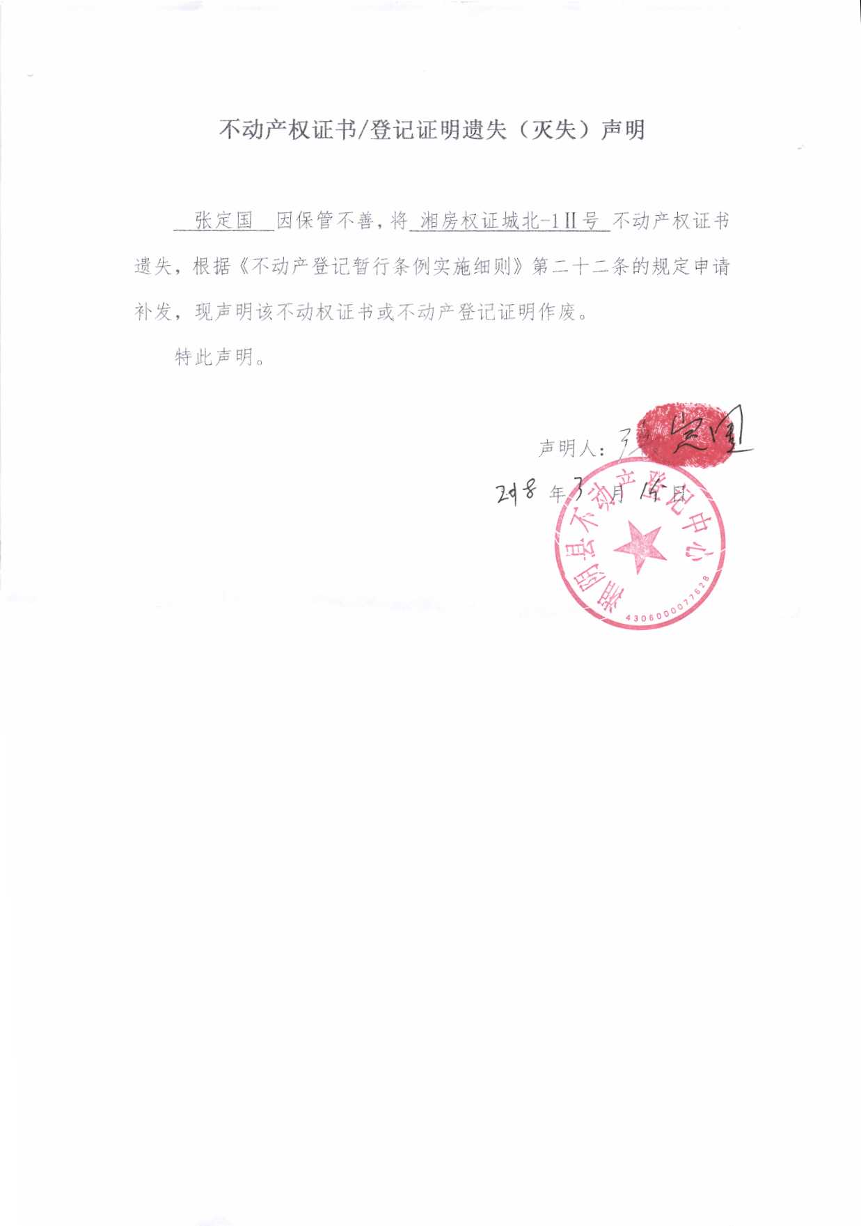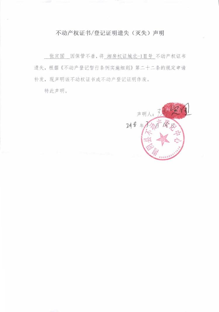 不动产权证书/登记证明遗失(灭失)声明|张定国