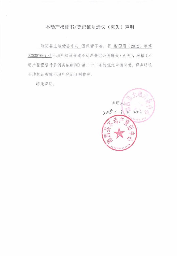 不动产权证书/登记证明遗失(灭失)声明|湘阴县土地储备中心