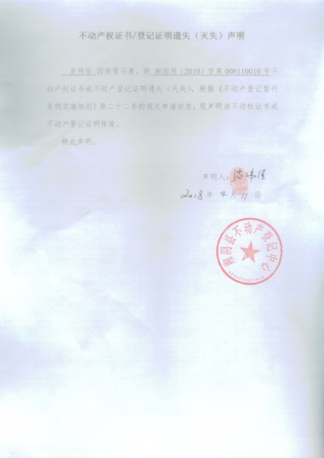 不动产权证书/登记证明遗失(灭失)声明|皮伟佳