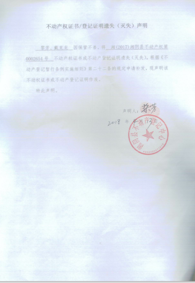 不动产权证书/登记证明遗失(灭失)声明|黎芳、戴克龙
