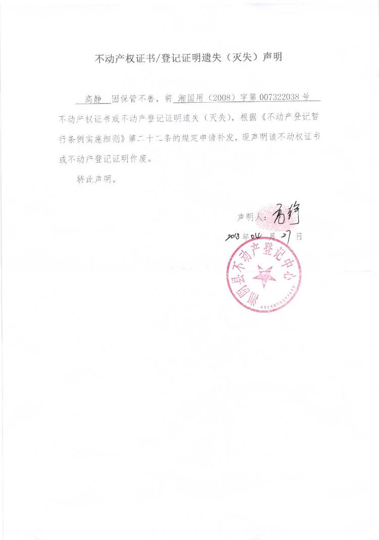 不动产权证书/登记证明遗失(灭失)声明|高静