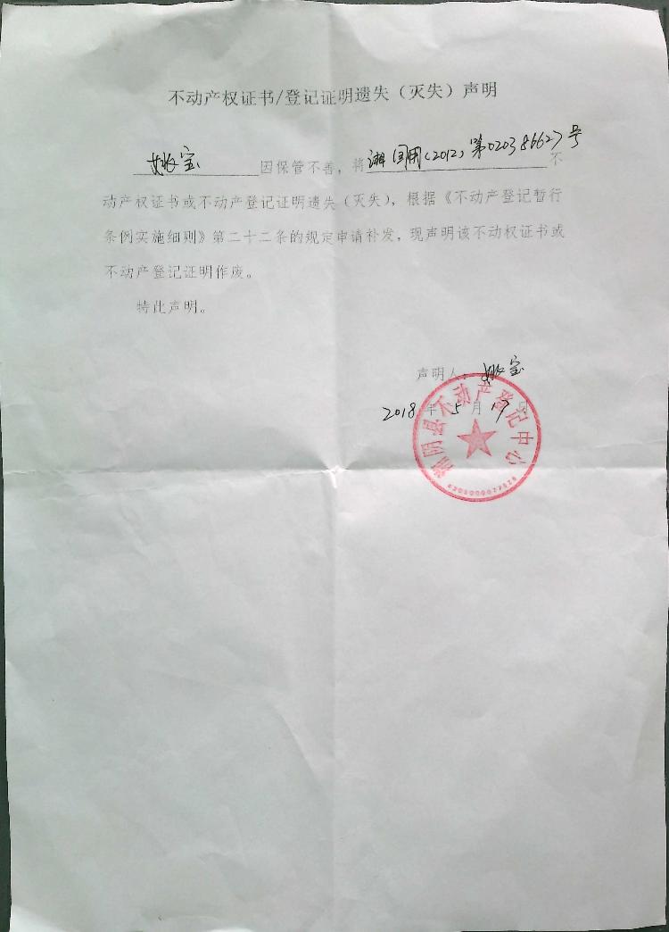 不动产权证书/登记证明遗失(灭失)声明|姚宝