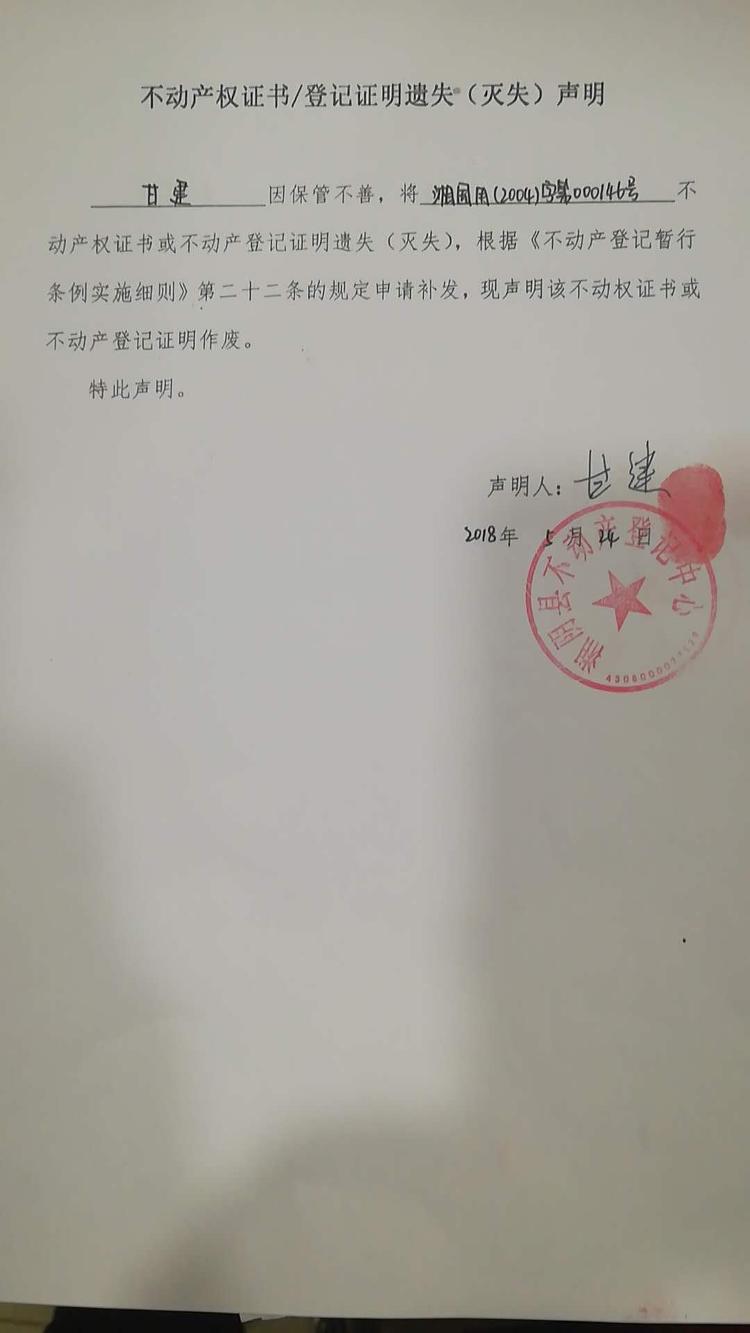 不动产权证书/登记证明遗失(灭失)声明|甘建