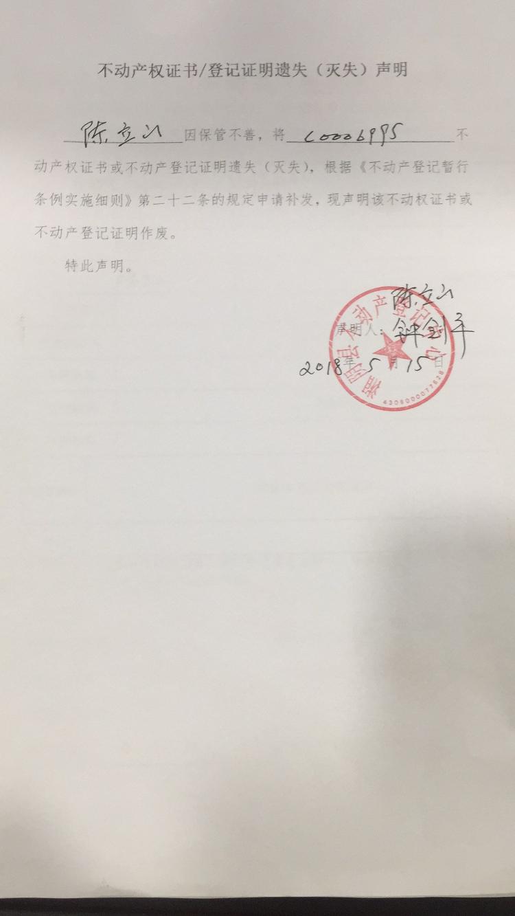 不动产权证书/登记证明遗失(灭失)声明|陈立山